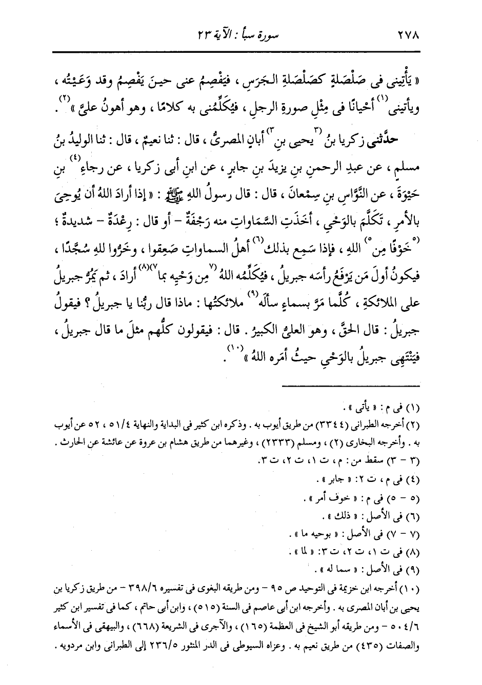 حَدَّثَنِي زَكَرِيَّا بْنُ أَبَانَ الْمِصْرِيِّ، قَالَ: ثنا نُعَيْمٌ، قَالَ: ثنا الْوَلِيدُ بْنُ مُسْلِمٍ، عَنْ عَبْدِ الرَّحْمَنِ بْنِ يَزِيدَ بْنِ جَابِرٍ، عَنِ ابْنِ أَبِي زَكَرِيَّا، عَنْ رَجَاءِ بْنِ حَيْوَةَ، عَنِ النَّوَّاسِ بْنِ سَمْعَانَ، قَالَ: قَالَ رَسُولُ اللَّهِ صَلَّى اللهُ عَلَيْهِ وَسَلَّمَ: " §إِذَا أَرَادَ اللَّهُ أَنْ يُوحِيَ بِالْأَمْرِ تَكَلَّمَ بِالْوَحْيِ، أَخَذَتِ السَّمَوَاتُ مِنْهُ رَجْفَةً أَوْ قَالَ رَعْدَةً شَدِيدَةً خَوْفَ أَمْرِ اللَّهِ، فَإِذَا سَمِعَ بِذَلِكَ أَهْلُ السَّمَوَاتِ صَعِقُوا وَخَرُّوا لِلَّهِ سُجَّدًا، فَيَكُونُ أَوَّلَ مَنْ يَرْفَعُ رَأْسَهُ جَبْرَائِيلُ، فَيُكَلِّمُهُ اللَّهُ مِنْ وَحْيِهِ بِمَا أَرَادَ، ثُمَّ يَمُرُّ جَبْرَائِيلُ عَلَى الْمَلَائِكَةِ كُلَّمَا مَرَّ بِسَمَاءٍ سَأَلَهُ مَلَائِكَتُهَا مَاذَا قَالَ رَبُّنَا يَا جَبْرَائِيلُ؟ فَيَقُولُ جَبْرَائِيلُ قَالَ الْحَقَّ وَهُوَ الْعَلِيُّ الْكَبِيرُ، قَالَ: فَيَقُولُونَ كُلُّهُمْ مِثْلَ مَا قَالَ جَبْرَائِيلُ، فَيَنْتَهِي جَبْرَائِيلُ بِالْوَحْيِ حَيْثُ أَمَرَهُ اللَّهُ "