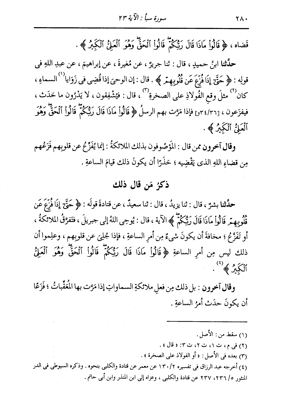 ذِكْرُ مَنْ قَالَ ذَلِكَ: حَدَّثَنَا بِشْرٌ، قَالَ: ثنا يَزِيدُ، قَالَ: ثنا سَعِيدٌ، عَنْ قَتَادَةَ، قَوْلُهُ: {حَتَّى إِذَا فُزِّعَ عَنْ قُلُوبِهِمْ، قَالُوا مَاذَا قَالَ رَبُّكُمْ} [سبأ: 23] الْآيَةَ، قَالَ: " §يُوحِي اللَّهُ إِلَى جَبْرَائِيلَ، فَتُفَرَّقَ الْمَلَائِكَةُ، أَوْ تَفْزَعُ مَخَافَةَ أَنْ يَكُونَ شَيْءٌ مِنْ أَمْرِ السَّاعَةِ، فَإِذَا جُلِّيَ عَنْ قُلُوبِهِمْ، وَعَلِمُوا أَنَّهُ لَيْسَ ذَلِكَ مِنْ أَمْرِ السَّاعَةِ {قَالُوا مَاذَا قَالَ رَبُّكُمْ قَالُوا الْحَقَّ وَهُوَ الْعَلِيُّ الْكَبِيرُ} [سبأ: 23] وَقَالَ آخَرُونَ: بَلْ ذَلِكَ مِنْ فِعْلِ مَلَائِكَةِ السَّمَوَاتِ إِذَا مَرَّتْ بِهَا الْمُعَقِّبَاتُ فَزَعًا أَنْ يَكُونَ حَدَثَ أَمْرُ السَّاعَةِ "