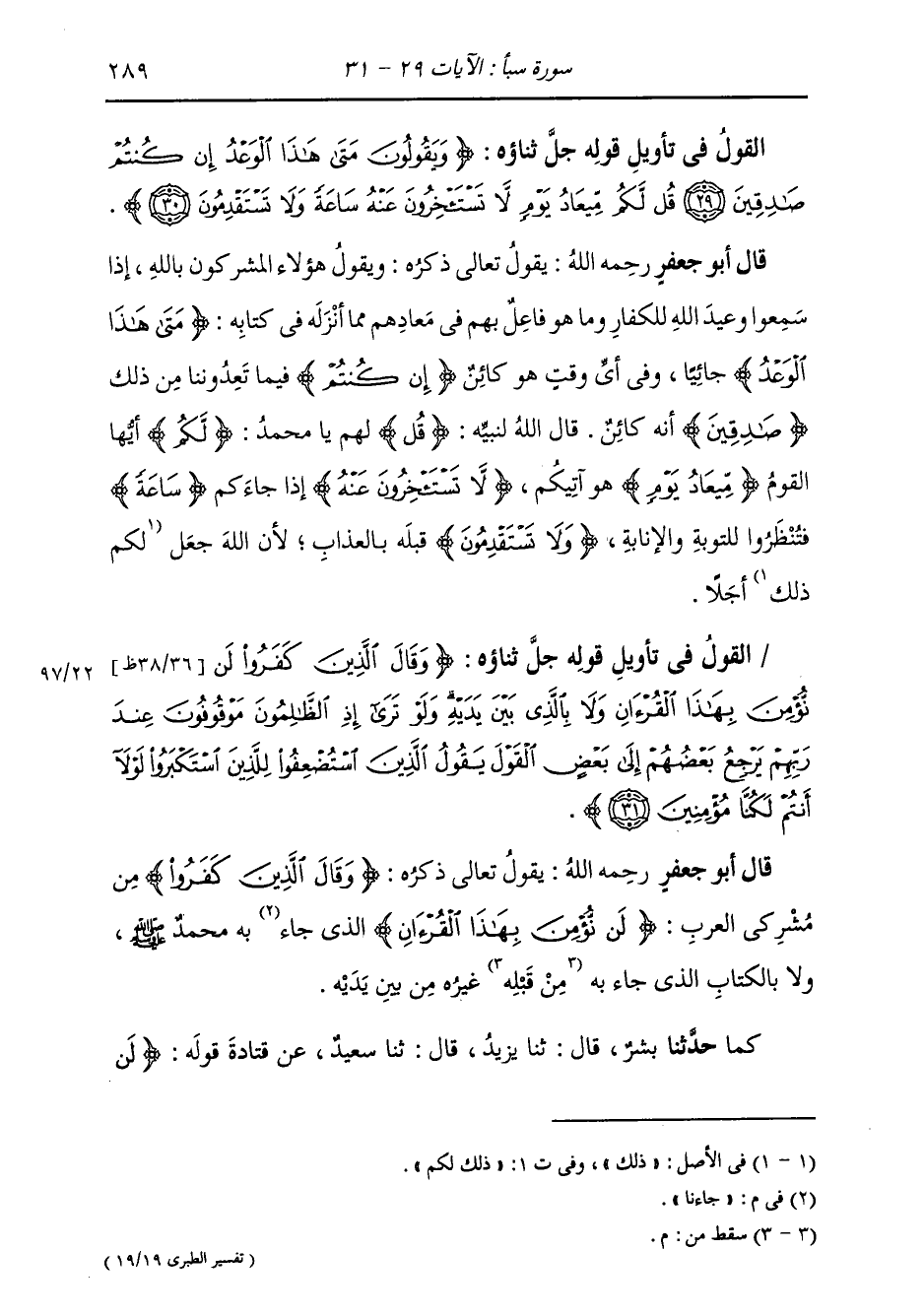 §الْقَوْلُ فِي تَأْوِيلِ قَوْلِهِ تَعَالَى: {وَيَقُولُونَ مَتَى هَذَا الْوَعْدِ إِنْ كُنْتُمْ صَادِقِينَ قُلْ لَكُمْ مِيعَادُ يَوْمٍ لَّا تَسْتَأْخِرُونَ عَنْهُ سَاعَةً وَلَا تَسْتَقْدِمُونَ} [سبأ: 30] يَقُولُ تَعَالَى ذِكْرُهُ: وَيَقُولُ هَؤُلَاءِ الْمُشْرِكُونَ بِاللَّهِ إِذَا سَمِعُوا وَعِيدَ اللَّهِ الْكُفَّارَ وَمَا هُوَ فَاعِلٌ بِهِمْ فِي مَعَادِهِمْ مِمَّا أَنْزَلَ اللَّهُ فِي كِتَابِهِ: {مَتَى هَذَا الْوَعْدُ} [يونس: 48] جَائِيًا، وَفِي أَيِّ وَقْتٍ هُوَ كَائِنٌ {إِنْ كُنْتُمْ} [البقرة: 23] فِيمَا تَعِدُونَنَا مِنْ ذَلِكَ {صَادِقِينَ} [البقرة: 23] أَنَّهُ كَائِنٌ قَالَ اللَّهُ لِنَبِيِّهِ: {قُلْ} [البقرة: 80] لَهُمْ يَا مُحَمَّدُ: {لَكُمْ} [البقرة: 22] أَيُّهَا الْقَوْمُ {مِيعَادُ يَوْمٍ} [سبأ: 30] هُوَ آتِيكُمْ {لَا تَسْتَأْخِرُونَ عَنْهُ} [سبأ: 30] إِذَا جَاءَكُمْ {سَاعَةً} [الأعراف: 34] فَتَنْظُرُوا لِلتَّوْبَةِ وَالْإِنَابَةِ {وَلَا تَسْتَقْدِمُونَ} [سبأ: 30] قِبَلَهُ بِالْعَذَابِ، لِأَنَّ اللَّهَ جَعَلَ لَكُمْ ذَلِكَ أَجَلًا