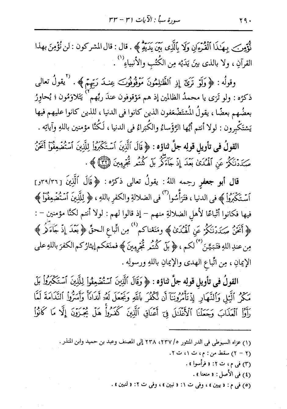 §الْقَوْلُ فِي تَأْوِيلِ قَوْلِهِ تَعَالَى: {قَالَ الَّذِينَ اسْتَكْبَرُوا لِلَّذِينَ اسْتُضْعِفُوا أَنَحْنُ صَدَدْنَاكُمْ عَنِ الْهُدَى بَعْدَ إِذْ جَاءَكُمْ بَلْ كُنْتُمْ مُجْرِمِينَ} [سبأ: 32] يَقُولُ تَعَالَى ذِكْرُهُ: {قَالَ الَّذِينَ اسْتَكْبَرُوا} [الأعراف: 76] فِي الدُّنْيَا، فَرَأَسُوا فِي الضَّلَالَةِ وَالْكُفْرِ بِاللَّهِ {لِلَّذِينَ اسْتُضْعِفُوا} [الأعراف: 75] فِيهَا فَكَانُوا أَتْبَاعًا لِأَهْلِ الضَّلَالَةِ مِنْهُمْ إِذْ قَالُوا لَهُمْ: {لَوْلَا أَنْتُمْ لَكُنَّا مُؤْمِنِينَ} [سبأ: 31] ، {أَنَحْنُ صَدَدْنَاكُمْ عَنِ الْهُدَى} [سبأ: 32] وَمَنَعْنَاكُمْ مِنَ اتِّبَاعِ الْحَقِّ {بَعْدَ إِذْ جَاءَكُمْ} [سبأ: 32] مِنْ عِنْدِ اللَّهِ، يُبَيِّنُ لَكُمْ {بَلْ كُنْتُمْ مُجْرِمِينَ} [سبأ: 32] فَمَنَعَكُمْ إِيثَارُكُمُ الْكُفْرَ بِاللَّهِ عَلَى الْإِيمَانِ مِنَ اتِّبَاعِ الْهُدَى وَالْإِيمَانِ بِاللَّهِ وَرَسُولِهِ