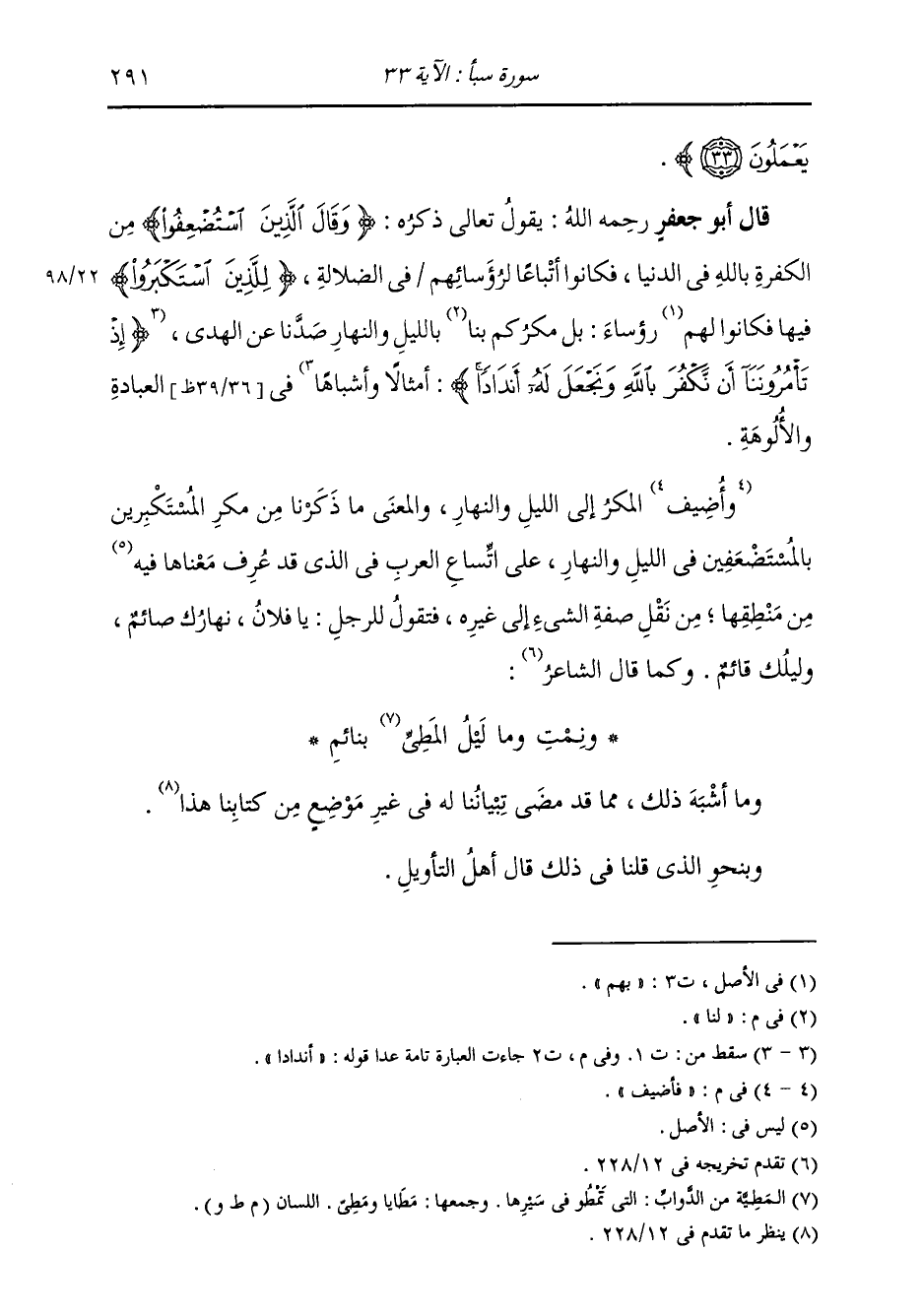 يَعْمَلُونَ} [سبأ: 33] يَقُولُ تَعَالَى ذِكْرُهُ: {وَقَالَ الَّذِينَ اسْتُضْعِفُوا} [سبأ: 33] مِنَ الْكَفَرَةِ بِاللَّهِ فِي الدُّنْيَا، فَكَانُوا أَتْبَاعًا لِرُؤَسَائِهِمْ فِي الضَّلَالَةِ {لِلَّذِينَ اسْتَكْبَرُوا} [إبراهيم: 21] فِيهَا، فَكَانُوا لَهُمْ رُؤَسَاءَ {بَلْ مَكْرُ} [سبأ: 33] كَمْ لَنَا بِـ {اللَّيْلِ وَالنَّهَارِ} [البقرة: 164] صَدَّنَا عَنِ الْهُدَى {إِذْ تَأْمُرُونَنَا أَنْ نَكْفُرَ بِاللَّهِ وَنَجْعَلَ لَهُ} [سبأ: 33] أَمْثَالًا وَأَشْبَاهًا فِي الْعِبَادَةِ وَالْأُلُوهَةِ؛ فَأُضِيفَ الْمَكْرُ إِلَى اللَّيْلِ وَالنَّهَارِ وَالْمَعْنَى مَا ذَكَرْنَا مِنْ مَكْرِ الْمُسْتَكْبِرِينَ بِالْمُسْتَضْعَفِينَ فِي اللَّيْلِ وَالنَّهَارِ، عَلَى اتِّسَاعِ الْعَرَبِ فِي الَّذِي قَدْ عَرَفَ مَعْنَاهَا فِيهِ مِنْ مَنْطِقِهَا، مِنْ نَقْلِ صِفَةِ الشَّيْءِ إِلَى غَيْرِهِ، فَتَقُولُ لِلرَّجُلِ: يَا فُلَانُ نَهَارُكَ صَائِمٌ وَلَيْلُكَ قَائِمٌ، وَكَمَا قَالَ الشَّاعِرُ: وَنِمْتِ وَمَا لَيْلُ الْمَطِيِّ بِنَائِمِ وَمَا أَشْبَهُ ذَلِكَ مِمَّا قَدْ مَضَى بَيَانًا لَهُ فِي غَيْرِ هَذَا الْمَوْضِعِ مِنْ كِتَابِنَا هَذَا وَبِنَحْوِ الَّذِي قُلْنَا فِي ذَلِكَ قَالَ أَهْلُ التَّأْوِيلِ