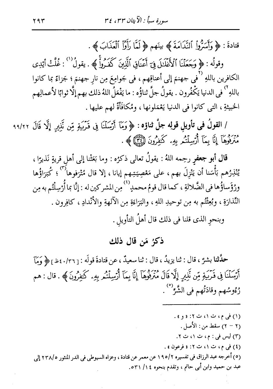 §الْقَوْلُ فِي تَأْوِيلِ قَوْلِهِ تَعَالَى: {وَمَا أَرْسَلْنَا فِي قَرْيَةٍ مِنْ نَذِيرٍ إِلَّا قَالَ مُتْرَفُوهَا إِنَّا بِمَا أُرْسِلْتُمْ بِهِ كَافِرُونَ} [سبأ: 34] يَقُولُ تَعَالَى ذِكْرُهُ: وَمَا بَعَثَنَا إِلَى أَهْلِ قَرْيَةٍ نَذِيرًا يُنْذِرُهُمْ بَأْسَنَا أَنْ يَنْزِلَ بِهِمْ عَلَى مَعْصِيَتِهِمْ إِيَّانَا، إِلَّا قَالَ كُبَرَاؤُهَا وَرُؤَسَاؤُهَا فِي الضَّلَالَةِ كَمَا قَالَ قَوْمُ فِرْعَوْنَ مِنَ الْمُشْرِكِينَ لَهُ: إِنَّا بِمَا أُرْسِلْتُمْ بِهِ مِنَ النِّذَارَةِ، وَبُعِثْتُمْ بِهِ مِنْ تَوْحِيدِ اللَّهِ، وَالْبَرَاءَةِ مِنَ الْآلِهَةِ وَالْأَنْدَادِ كَافِرُونَ وَبِنَحْوِ الَّذِي قُلْنَا فِي ذَلِكَ قَالَ أَهْلُ التَّأْوِيلِ