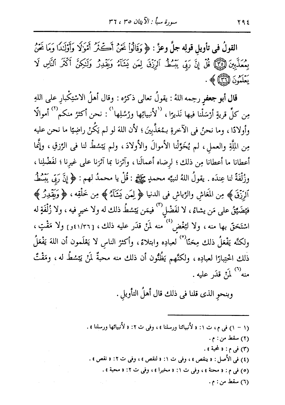 §الْقَوْلُ فِي تَأْوِيلِ قَوْلِهِ تَعَالَى: {وَقَالُوا نَحْنُ أَكْثَرُ أَمْوَالًا وَأَوْلَادًا وَمَا نَحْنُ بِمُعَذَّبِينَ قُلْ إِنَّ رَبِّي يَبْسُطُ الرِّزْقَ لِمَنْ يَشَاءُ وَيَقْدِرُ وَلَكِنَّ أَكْثَرَ النَّاسِ لَا يَعْلَمُونَ} [سبأ: 36] يَقُولُ تَعَالَى ذِكْرُهُ: وَقَالَ أَهْلُ الِاسْتِكْبَارِ عَلَى اللَّهِ مِنْ كُلِّ قَرْيَةٍ أَرْسَلْنَا فِيهَا نَذِيرًا لِأَنْبِيَائِنَا وَرُسِلِنَا: {نَحْنُ أَكْثَرُ أَمْوَالًا وَأَوْلَادًا} [سبأ: 35] وَمَا نَحْنُ فِي الْآخِرَةِ {بِمُعَذَّبِينَ} [الشعراء: 138] لِأَنَّ اللَّهَ لَوْ لَمْ يَكُنْ رَاضِيًا مَا نَحْنُ عَلَيْهِ مِنَ الْمِلَّةِ وَالْعَمَلِ لَمْ يُخَوِّلْنَا الْأَمْوَالَ وَالْأَوْلَادَ، وَلَمْ يَبْسُطْ لَنَا فِي الرِّزْقِ، وَإِنَّمَا أَعْطَانَا مَا أَعْطَانَا مِنْ ذَلِكَ لِرِضَاهُ أَعْمَالَنَا، وَآثَرَنَا بِمَا آثَرَنَا عَلَى غَيْرِنَا لِفَضْلِنَا، وَزُلْفَةٍ لَنَا عِنْدَهُ، يَقُولُ اللَّهُ لِنَبِيِّهِ مُحَمَّدٍ صَلَّى اللهُ عَلَيْهِ وَسَلَّمَ: قُلْ لَهُمْ يَا مُحَمَّدُ: {إِنَّ رَبِّي يَبْسُطُ الرِّزْقَ} [سبأ: 36] مِنَ الْمَعَاشِ وَالرِّيَاشِ فِي الدُّنْيَا {لِمَنْ يَشَاءُ} [البقرة: 261] مِنْ خَلْقِهِ {وَيَقْدِرُ} [الرعد: 26] فَيُضَيَّقُ عَلَى مَنْ يَشَاءُ لَا لِمَحَبَّةٍ فِيمَنْ يَبْسُطُ لَهُ ذَلِكَ وَلَا خَيْرٍ فِيهِ وَلَا زُلْفَةٍ لَهُ، اسْتَحَقَّ بِهَا مِنْهُ، وَلَا لِبُغْضٍ مِنْهُ لِمَنْ قَدَرَ عَلَيْهِ ذَلِكَ، وَلَا مَقْتٍ، وَلَكِنَّهُ يَفْعَلُ ذَلِكَ مِحْنَةً لِعِبَادِهِ وَابْتِلَاءً، وَأَكْثَرُ النَّاسِ لَا يَعْلَمُونَ أَنَّ اللَّهَ يَفْعَلُ ذَلِكَ اخْتِبَارًا لِعِبَادِهِ، وَلَكِنَّهُمْ يَظُنُّونَ أَنَّ ذَلِكَ مِنْهُ مَحَبَّةٌ لِمَنْ بَسَطَ لَهُ وَمَقْتٌ لِمَنْ قَدَرَ عَلَيْهِ وَبِنَحْوِ الَّذِي قُلْنَا فِي ذَلِكَ قَالَ أَهْلُ التَّأْوِيلِ
