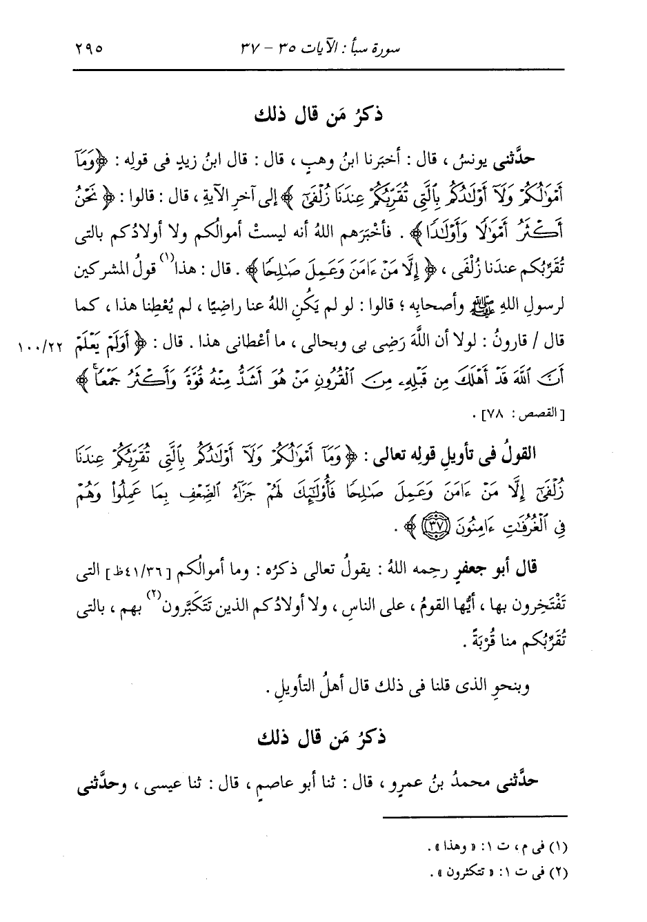 ذِكْرُ مَنْ قَالَ ذَلِكَ: حَدَّثَنِي يُونُسُ، قَالَ: أَخْبَرَنَا ابْنُ وَهْبٍ، قَالَ: قَالَ ابْنُ زَيْدٍ، فِي قَوْلِهِ: {§وَمَا أَمْوَالُكُمْ وَلَا أَوْلَادَكُمْ بِالَّتِي تُقَرِّبُكُمْ عِنْدَنَا زُلْفَى} [سبأ: 37] الْآيَةَ، قَالَ: " قَالُوا: نَحْنُ أَكْثَرُ أَمْوَالًا وَأَوْلَادًا، فَأَخْبَرَهُمُ اللَّهُ أَنَّهُ لَيْسَتْ أَمْوَالُكُمْ وَلَا أَوْلَادُكُمْ بِالَّتِي تُقَرِّبُكُمْ عِنْدَنَا زُلْفَى، {إِلَّا مَنْ آمَنَ وَعَمِلَ صَالِحًا} [سبأ: 37] ، قَالَ: وَهَذَا قَوْلُ الْمُشْرِكِينَ لِرَسُولِ اللَّهِ صَلَّى اللهُ عَلَيْهِ وَسَلَّمَ وَأَصْحَابِهِ، قَالُوا: لَوْ لَمْ يَكُنِ اللَّهُ عَنَّا رَاضِيًّا لَمْ يُعْطِنَا هَذَا، كَمَا قَالَ قَارُونُ: لَوْلَا أَنَّ اللَّهَ رَضِيَ بِي وِبِحَالِي مَا أَعْطَانِي هَذَا، قَالَ: {أَوَلَمْ يَعْلَمْ أَنَّ اللَّهَ قَدْ أَهْلَكَ مِنْ قَبْلَهُ مِنَ الْقُرُونِ} [القصص: 78] إِلَى آخِرِ الْآيَةِ "