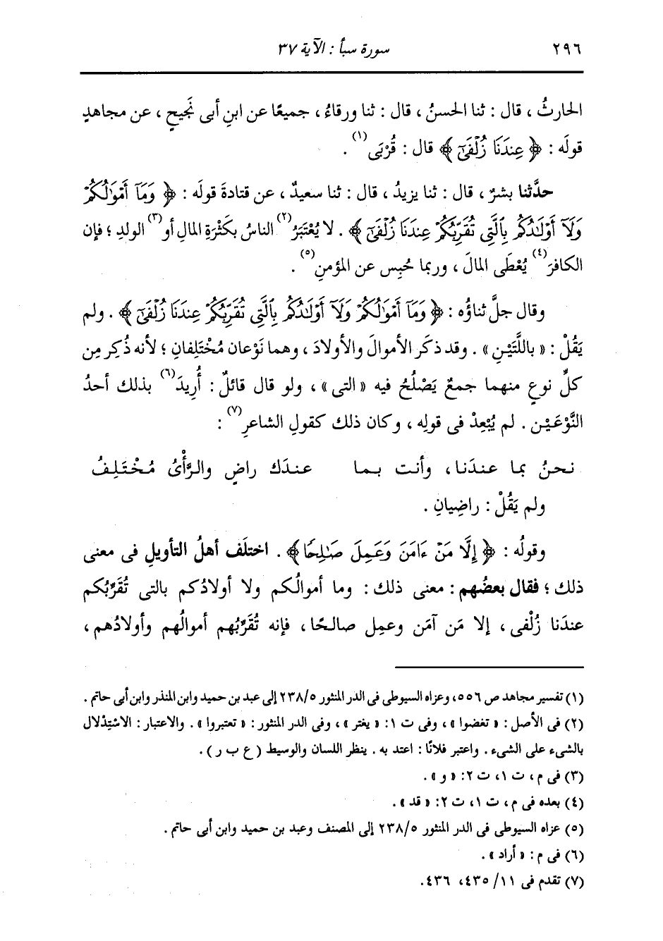§وَقَوْلُهُ: {إِلَّا مَنْ آمَنَ وَعَمِلَ صَالِحًا} [سبأ: 37] اخْتَلَفَ أَهْلُ التَّأْوِيلِ فِي مَعْنَى ذَلِكَ؛ فَقَالَ بَعْضُهُمْ: مَعْنَى ذَلِكَ: وَمَا أَمْوَالُكُمْ وَلَا أَوْلَادُكُمْ بِالَّتِي تُقَرِّبُكُمْ عِنْدَنَا زُلْفَى، إِلَّا مَنْ آمَنَ وَعَمِلَ صَالِحًا، فَإِنَّهُ تَقْرَبُهُمْ أَمْوَالُهُمْ وَأَوْلَادُهُمْ -[297]- بِطَاعَتِهِمُ اللَّهِ فِي ذَلِكَ وَأَدَائِهِمْ فِيهِ حَقَّهُ إِلَى اللَّهِ زُلْفَى دُونَ أَهْلِ الْكُفْرِ بِاللَّهِ