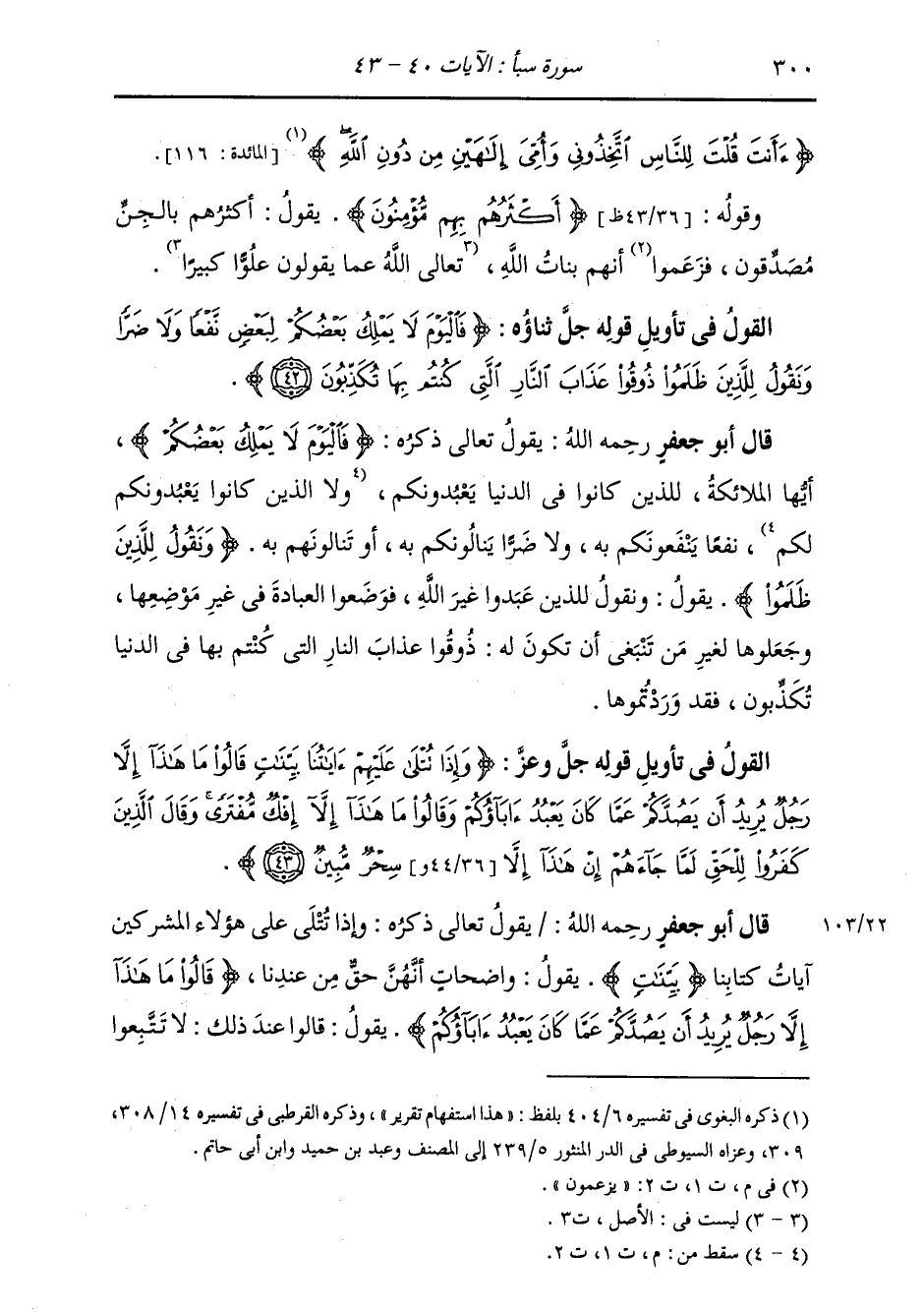 §الْقَوْلُ فِي تَأْوِيلِ قَوْلِهِ تَعَالَى: {فَالْيَوْمَ لَا يَمْلِكُ بَعْضُكُمْ لِبَعْضٍ نَفْعًا وَلَا ضَرًّا وَنَقُولُ لِلَّذِينَ ظَلَمُوا ذُوقُوا عَذَابَ النَّارِ الَّتِي كُنْتُمْ بِهَا تُكَذِّبُونَ} [سبأ: 42] يَقُولُ تَعَالَى ذِكْرُهُ: فَالْيَوْمَ لَا يَمْلِكُ بَعْضُكُمْ أَيُّهَا الْمَلَائِكَةُ لِلَّذِينَ كَانُوا فِي الدُّنْيَا يَعْبِدُونَكُمْ نَفْعًا يَنْفَعُونَكُمْ بِهِ وَلَا ضَرًّا يَنَالُونَكُمْ بِهِ، أَوْ تَنَالُونَهُمْ بِهِ {وَنَقُولُ لِلَّذِينَ ظَلَمُوا} [سبأ: 42] يَقُولُ: وَنَقُولُ لِلَّذِينَ عَبَدُوا غَيْرَ اللَّهِ فَوَضَعُوا الْعِبَادَةَ فِي غَيْرِ مَوْضِعِهَا، وَجَعَلُوهَا لِغَيْرِ مَنْ تَنْبَغِي أَنْ تَكُونَ لَهُ: {ذُوقُوا عَذَابَ النَّارِ الَّتِي كُنْتُمْ بِهَا} [سبأ: 42] فِي الدُّنْيَا {تُكَذِّبُونَ} [المؤمنون: 105] فَقَدْ وَرَدْتُمُوهَا