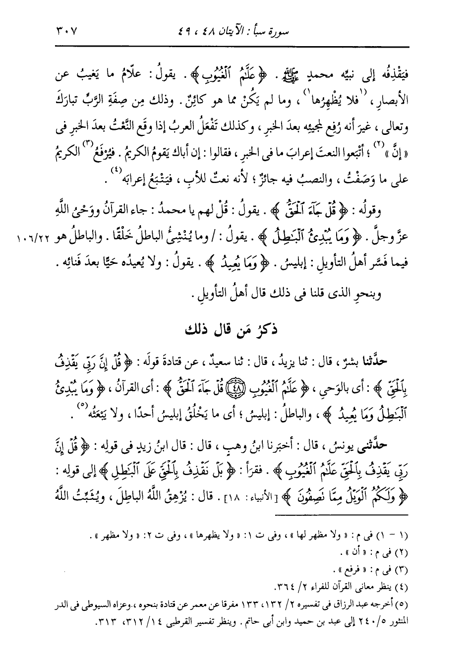 فَيَقْذِفُهُ إِلَى نَبِيِّهِ مُحَمَّدٍ صَلَّى اللهُ عَلَيْهِ وَسَلَّمَ {عَلَّامُ الْغُيُوبِ} [المائدة: 109] يَقُولُ: عَلَّامُ مَا يَغِيبُ عَنِ الْأَبْصَارِ، وَلَا مَظْهَرَ لَهَا، وَمَا لَمْ يَكُنْ مِمَّا هُوَ كَائِنٌ، وَذَلِكَ مِنْ صِفَةِ الرَّبِّ؛ غَيْرَ أَنَّهُ رُفِعَ لِمَجِيئِهِ بَعْدَ الْخَبَرِ، وَكَذَلِكَ تَفْعَلُ الْعَرَبُ إِذَا وَقَعَ النَّعْتُ بَعْدَ الْخَبَرِ، فِي أَنِ اتْبَعُوا النَّعْتَ أَعْرَابَ مَا فِي الْخَبَرِ، فَقَالُوا: إِنَّ أَبَاكَ يَقُومُ الْكَرِيمُ، فَرَفَعَ الْكَرِيمَ عَلَى مَا وَصَفْتُ، وَالنَّصْبُ فِيهِ جَائِزٌ، لِأَنَّهُ نَعْتٌ لِلْأَبٍ، فَيَتْبَعُ إِعْرَابَهُ {قُلْ جَاءَ الْحَقُّ} [سبأ: 49] يَقُولُ: قُلْ لَهُمْ يَا مُحَمَّدُ: جَاءَ الْقُرْآنُ وَوَحْيُ اللَّهِ {وَمَا يُبْدِئُ الْبَاطِلُ} [سبأ: 49] يَقُولُ: وَمَا يُنْشِئُ الْبَاطِلُ خَلْقًا؛ وَالْبَاطِلُ هُوَ فِيمَا فَسَّرَهُ أَهْلُ التَّأْوِيلِ: إِبْلِيسُ {وَمَا يُعِيدُ} [سبأ: 49] يَقُولُ: وَلَا يُعِيدُهُ حَيًّا بَعْدَ فَنَائِهِ وَبِنَحْوِ الَّذِي قُلْنَا فِي ذَلِكَ قَالَ أَهْلُ التَّأْوِيلِ