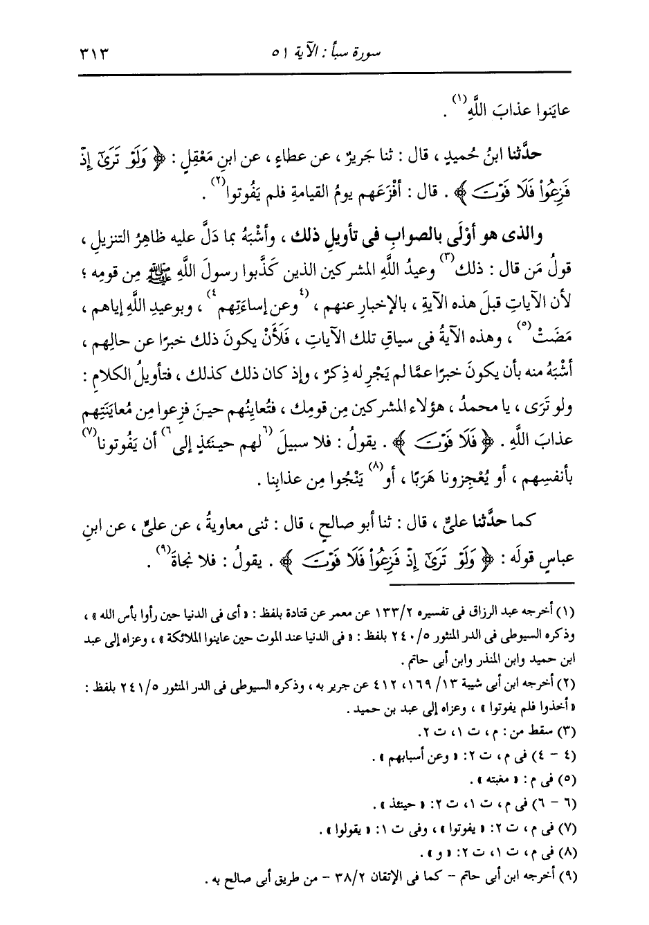 كَمَا: حَدَّثَنَا عَلِيٌّ، قَالَ: ثنا أَبُو صَالِحٍ، قَالَ: ثني مُعَاوِيَةُ، عَنْ عَلِيٍّ، عَنِ ابْنِ عَبَّاسٍ، قَوْلُهُ: {§وَلَوْ تَرَى إِذْ فَزِعُوا فَلَا فَوْتَ} [سبأ: 51] يَقُولُ: «فَلَا نَجَاةَ»