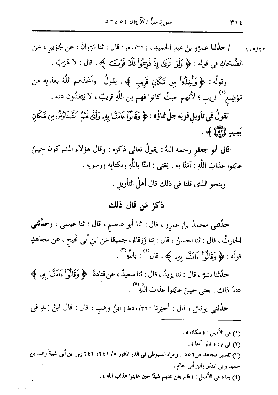 ذِكْرُ مَنْ قَالَ ذَلِكَ: حَدَّثَنِي مُحَمَّدُ بْنُ عَمْرٍو، قَالَ: ثنا أَبُو عَاصِمٍ، قَالَ: ثنا عِيسَى، وَحَدَّثَنِي الْحَارِثُ، قَالَ: ثنا الْحَسَنُ، قَالَ: ثنا وَرْقَاءُ، جَمِيعًا عَنِ ابْنِ أَبِي نَجِيحٍ، عَنْ مُجَاهِدٍ، قَوْلُهُ: {وَقَالُوا آمَنَّا بِهِ} [سبأ: 52] قَالُوا: «§آمَنَّا بِاللَّهِ»