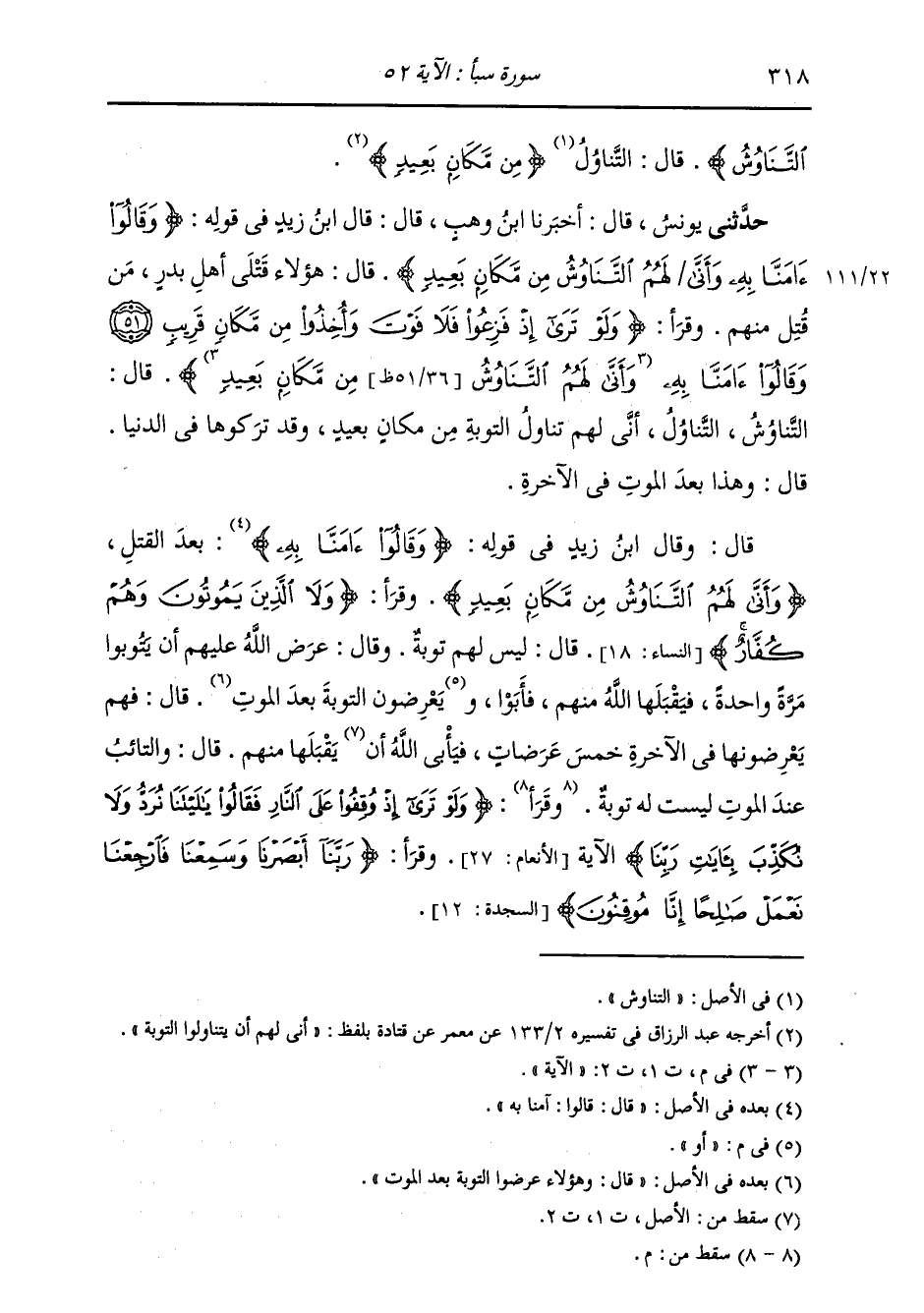 حَدَّثَنِي يُونُسُ، قَالَ: أَخْبَرَنَا ابْنُ وَهْبٍ، قَالَ: قَالَ ابْنُ زَيْدٍ، فِي قَوْلِهِ: {وَقَالُوا آمَنَّا بِهِ وَأَنَّى لَهُمُ التَّنَاوُشُ مِنْ مَكَانٍ بَعِيدٍ} [سبأ: 52] قَالَ: " §هَؤُلَاءِ قَتْلَى أَهْلِ بَدْرٍ مَنْ قُتِلَ مِنْهُمْ، وَقَرَأَ: {وَلَوْ تَرَى إِذْ فَزِعُوا فَلَا فَوْتَ وَأُخِذُوا مِنْ مَكَانٍ قَرِيبٍ وَقَالُوا آمَنَّا بِهِ} [سبأ: 52] الْآيَةَ، قَالَ: التَّنَاوُشُ: التَّنَاوُلُ، وَأَنَّى لَهُمْ تَنَاوَلُ التَّوْبَةِ مِنْ مَكَانٍ بَعِيدٍ، وَقَدْ تَرَكُوهَا فِي الدُّنْيَا، قَالَ: وَهَذَا بَعْدَ الْمَوْتِ فِي الْآخِرَةِ " قَالَ: وَقَالَ ابْنُ زَيْدٍ فِي قَوْلِهِ {وَقَالُوا آمَنَّا بِهِ} [سبأ: 52] بَعْدَ الْقَتْلِ {وَأَنَّى لَهُمُ التَّنَاوُشُ مِنْ مَكَانٍ بَعِيدٍ} [سبأ: 52] وَقَرَأَ: {وَلَا الَّذِينَ يَمُوتُونَ وَهُمْ كُفَّارٌ} [النساء: 18] قَالَ: لَيْسَ لَهُمْ تَوْبَةٌ، وَقَالَ: عَرَضَ اللَّهُ عَلَيْهِمْ أَنْ يَتُوبُوا مَرَّةً وَاحِدَةً، فَيَقْبَلُهَا اللَّهُ مِنْهُمْ، فَأَبَوْا، أَوْ يَعْرِضُونَ التَّوْبَةَ بَعْدَ الْمَوْتِ، قَالَ: فَهُمْ يَعْرِضُونَهَا فِي الْآخِرَةِ خَمْسَ عَرَضَاتٍ، فَيَأْبَى اللَّهُ أَنْ يَقْبَلَهَا مِنْهُمْ؛ قَالَ: وَالتَّائِبُ عِنْدَ الْمَوْتِ لَيْسَتْ لَهُ تَوْبَةٌ {وَلَوْ تَرَى إِذْ وُقِفُوا عَلَى النَّارِ فَقَالُوا يَا لَيْتَنَا نُرَدُّ وَلَا نُكَذَّبَ بِآيَاتِ رَبِّنَا} [الأنعام: 27] الْآيَةَ، وَقَرَأَ: {رَبَّنَا أَبْصَرْنَا وَسَمِعْنَا فَارْجِعْنَا نَعْمَلْ صَالِحًا إِنَّا مُوقِنُونَ} [السجدة: 12]