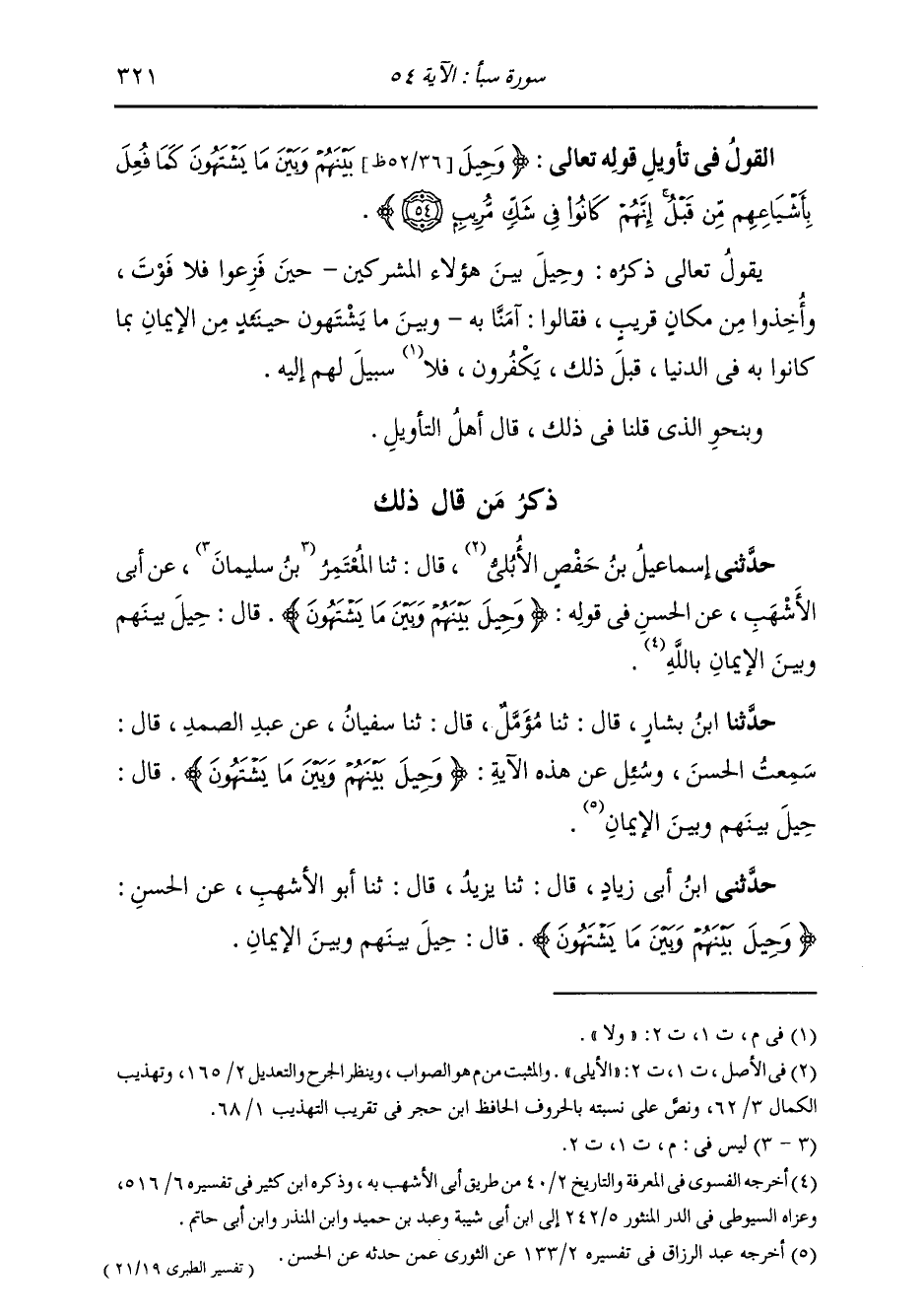 ذِكْرُ مَنْ قَالَ ذَلِكَ: حَدَّثَنِي إِسْمَاعِيلُ بْنُ حَفْصٍ الْأُبُلِّيُّ، قَالَ: ثنا الْمُعْتَمِرُ، عَنْ أَبِي الْأَشْهَبِ، عَنِ الْحَسَنِ، فِي قَوْلِهِ: {§وَحِيلَ بَيْنَهُمْ وَبَيْنَ مَا يَشْتَهُونَ} [سبأ: 54] قَالَ: «حِيلَ بَيْنَهُمْ وَبَيْنَ الْإِيمَانِ بِاللَّهِ»
