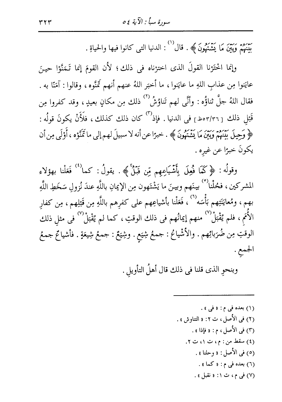 §وَقَوْلُهُ: {كَمَا فُعِلَ بِأَشْيَاعِهِمْ مِنْ قَبْلُ} [سبأ: 54] يَقُولُ فَعَلْنَا بِهَؤُلَاءِ الْمُشْرِكِينَ، فَحِلْنَا بَيْنَهُمْ وَبَيْنَ مَا يَشْتَهُونَ مِنَ الْإِيمَانِ بِاللَّهِ عِنْدَ نُزُولِ سَخَطِ اللَّهِ بِهِمْ، وَمُعَايَنَتِهِمْ بَأْسَهُ كَمَا فَعَلْنَا بِأَشْيَاعِهِمْ عَلَى كُفْرِهِمْ بِاللَّهِ مِنْ قَبْلِهِمْ مِنْ كُفَّارِ الْأُمَمِ، فَلَمْ نَقْبَلْ مِنْهُمْ إِيمَانَهُمْ فِي ذَلِكَ الْوَقْتِ، كَمَا لَمْ نَقْبَلْ فِي مِثْلِ ذَلِكَ الْوَقْتِ مِنْ ضُرَبَائِهِمْ. وَالْأَشْيَاعُ: جَمْعُ شِيَعٍ، وَشِيَعٍ: جَمْعُ شِيعَةٍ، فَأَشْيَاعُ جَمْعُ الْجَمْعِ وَبِنَحْوِ الَّذِي قُلْنَا فِي ذَلِكَ قَالَ أَهْلُ التَّأْوِيلِ