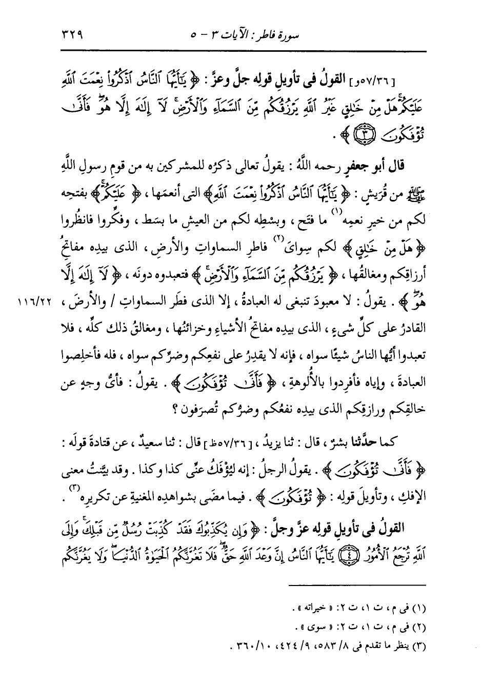 §الْقَوْلُ فِي تَأْوِيلِ قَوْلِهِ تَعَالَى: {يَا أَيُّهَا النَّاسُ اذْكُرُوا نِعْمَةَ اللَّهِ عَلَيْكُمْ هَلْ مِنْ خَالِقٍ غَيْرُ اللَّهِ يَرْزُقُكُمْ مِنَ السَّمَاءِ وَالْأَرْضِ لَا إِلَهَ إِلَّا هُوَ فَأَنَّى تُؤْفَكُونَ} يَقُولُ تَعَالَى ذِكْرُهُ لِلْمُشْرِكِينَ بِهِ مِنْ قَوْمِ رَسُولِ اللَّهِ صَلَّى اللهُ عَلَيْهِ وَسَلَّمَ مِنْ قُرَيْشٍ: {يَا أَيُّهَا النَّاسُ اذْكُرُوا نِعْمَةَ اللَّهِ} الَّتِي أَنْعَمَهَا {عَلَيْكُمْ} [البقرة: 40] بِفَتْحِهِ لَكُمْ مِنْ خَيْرَاتِهِ مَا فَتْحَ وَبَسْطِهِ لَكُمْ مِنَ الْعَيْشِ مَا بَسَطَ وَفَكَّرُوا فَانْظُرُوا هَلْ مِنْ خَالِقٍ سِوَى فَاطِرِ السَّمَوَاتِ وَالْأَرْضِ الَّذِي بِيَدِهِ مَفَاتِيحُ أَرْزَاقِكُمْ وَمَغَالِقُهَا {يَرْزُقُكُمْ مِنَ السَّمَاءِ وَالْأَرْضِ} [يونس: 31] فَتَعْبُدُوهُ دُونَهُ {لَا إِلَهَ إِلَّا هُوَ} [البقرة: 163] يَقُولُ: لَا مَعْبُودَ تَنْبَغِي لَهُ الْعِبَادَةُ إِلَّا الَّذِي فَطَرَ السَّمَوَاتَ وَالْأَرْضَ، الْقَادِرُ عَلَى كُلِّ شَيْءٍ، الَّذِي بِيَدِهِ مَفَاتِحُ الْأَشْيَاءِ وَخَزَائِنُهَا، وَمَغَالِقُ ذَلِكَ كُلِّهِ، فَلَا تَعْبُدُوا أَيُّهَا النَّاسُ شَيْئًا سِوَاهُ، فَإِنَّهُ لَا يَقْدِرُ عَلَى نَفْعِكُمْ وَضُرِّكُمْ سِوَاهُ، فَلَهُ فَأَخْلِصُوا الْعِبَادَةَ، وَإِيَّاهُ فَأَفْرِدُوا بِالْأُلُوهَةِ {فَأَنَّى تُؤْفَكُونَ} [الأنعام: 95] يَقُولُ: فَأَيُّ وَجْهٍ عَنْ خَالِقِكُمْ وَرَازِقِكُمُ الَّذِي بِيَدِهِ نَفْعُكُمْ وَضَرُّكُمْ تُصْرَفُونَ