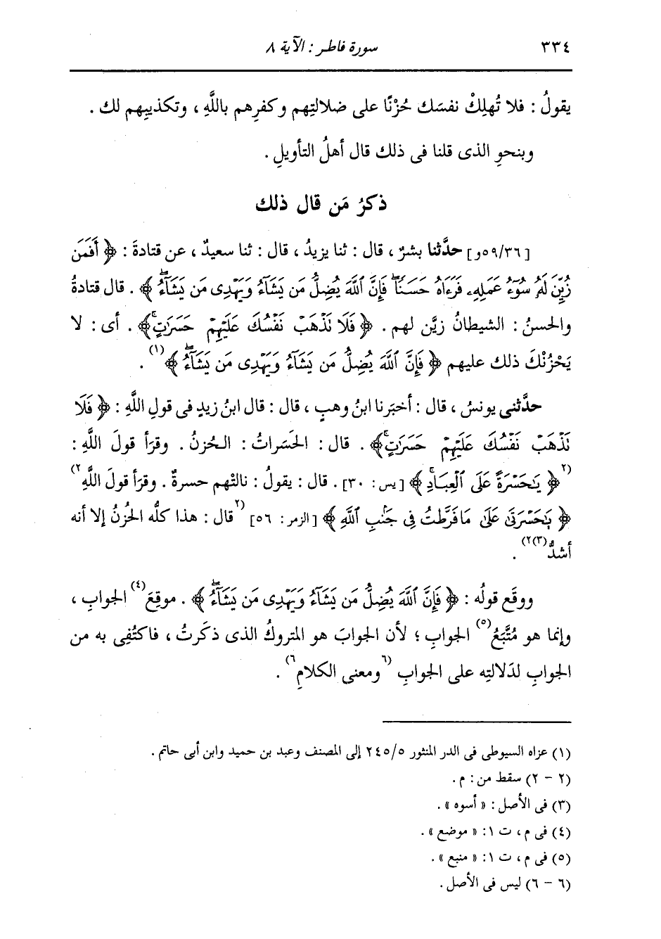 ذِكْرُ مَنْ قَالَ ذَلِكَ: حَدَّثَنَا بِشْرٌ، قَالَ: ثنا يَزِيدُ، قَالَ: ثنا سَعِيدٌ، عَنْ قَتَادَةَ، {§أَفَمِنْ زُيِّنَ لَهُ سُوءُ عَمَلِهِ فَرَآهُ حَسَنًا فَإِنَّ اللَّهَ يُضِلُّ مَنْ يَشَاءُ وَيَهْدِي مَنْ يَشَاءُ} [فاطر: 8] قَالَ قَتَادَةُ وَالْحَسَنُ: «الشَّيْطَانُ زَيَّنَ لَهُمْ» {فَلَا تَذْهَبْ نَفْسُكَ عَلَيْهِمْ حَسَرَاتٍ} [فاطر: 8] «لَا يُحْزُنْكَ ذَلِكَ عَلَيْهِمْ، فَإِنَّ اللَّهَ يُضِلَّ مَنْ يَشَاءُ، وَيَهْدِي مَنْ يَشَاءُ»