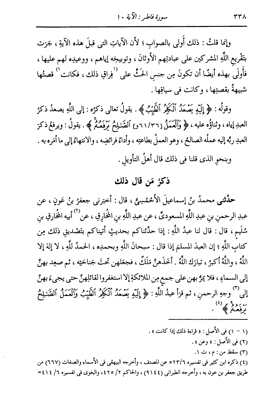 §وَقَوْلُهُ: {إِلَيْهِ يَصْعَدُ الْكَلِمُ الطَّيِّبُ} [فاطر: 10] يَقُولُ تَعَالَى ذِكْرُهُ: إِلَى اللَّهِ يَصْعَدُ ذِكْرُ الْعَبْدِ إِيَّاهُ وَثَنَاؤُهُ عَلَيْهِ {وَالْعَمَلُ الصَّالِحُ يَرْفَعُهُ} [فاطر: 10] يَقُولُ: وَيُرْفَعُ ذِكْرُ الْعَبْدِ رَبَّهُ إِلَيْهِ عَمَلَهُ الصَّالِحَ، وَهُوَ الْعَمَلُ بِطَاعَتِهِ، وَأَدَاءِ فَرَائِضِهِ، وَالِانْتِهَاءِ إِلَى مَا أَمَرَ بِهِ وَبِنَحْوِ الَّذِي قُلْنَا فِي ذَلِكَ قَالَ أَهْلُ التَّأْوِيلِ