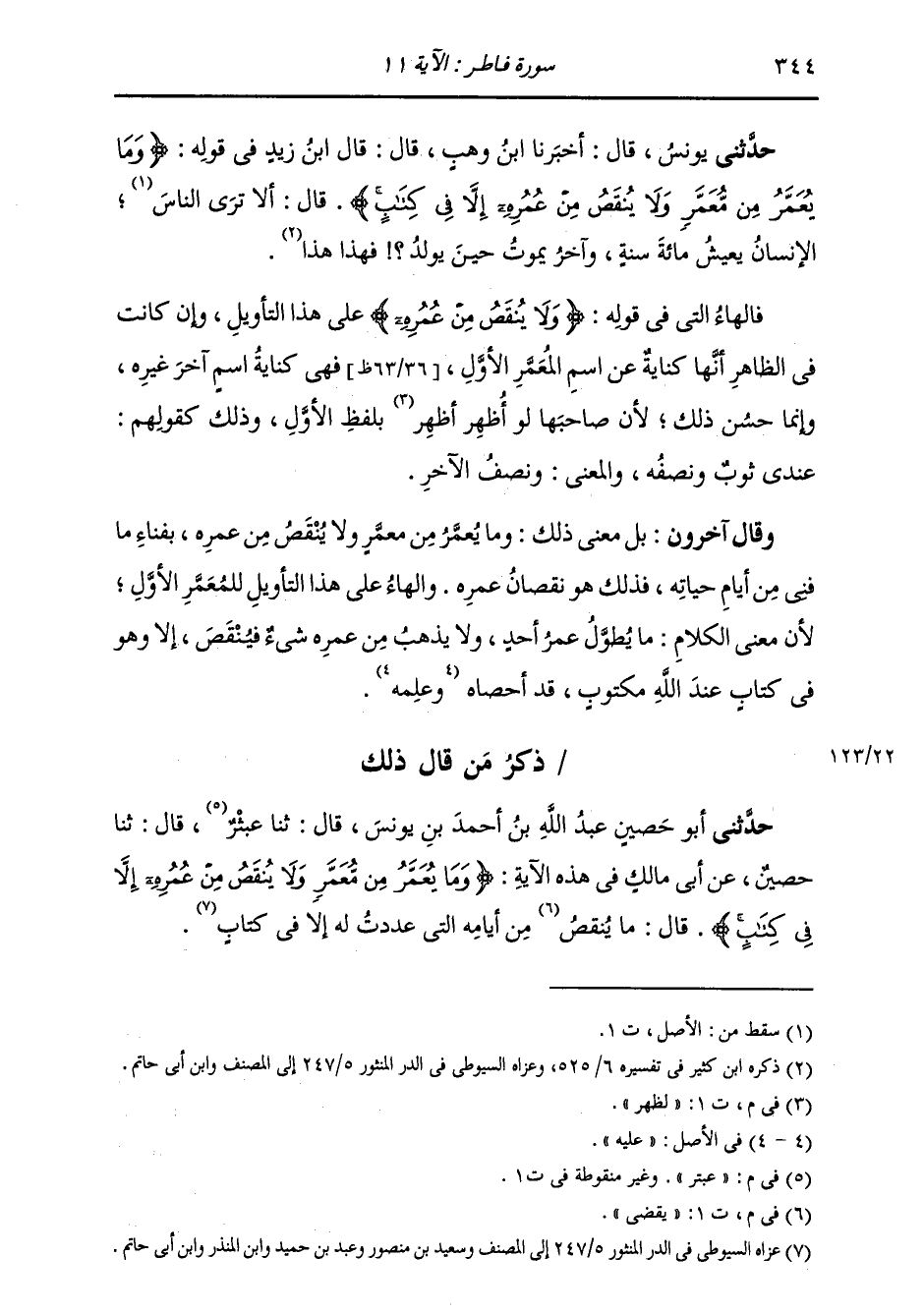 حَدَّثَنِي يُونُسُ، قَالَ: أَخْبَرَنَا ابْنُ وَهْبٍ، قَالَ: قَالَ ابْنُ زَيْدٍ، فِي قَوْلِهِ: {وَمَا يُعَمَّرُ مِنْ مُعَمَّرٍ وَلَا يُنْقَصُ مِنْ عُمُرِهِ إِلَّا فِي كِتَابٍ} [فاطر: 11] قَالَ: «§أَلَا تَرَى النَّاسُ الْإِنْسَانَ يَعِيشُ مِائَةَ سَنَةٍ، وَآخَرَ يَمُوتُ حِينَ يُولَدُ؟ فَهَذَا هَذَا» فَالْهَاءُ الَّتِي فِي قَوْلِهِ {وَلَا يُنْقَصُ مِنْ عُمُرِهِ} [فاطر: 11] عَلَى هَذَا التَّأْوِيلِ وَإِنْ كَانَتْ فِي الظَّاهِرِ أَنَّهَا كِنَايَةٌ عَنِ اسْمِ الْمُعَمَّرِ الْأَوَّلِ، فَهِيَ كِنَايَةٌ عَنِ اسْمٍ آخَرَ غَيْرِهِ، وَإِنَّمَا حَسُنَ ذَلِكَ لِأَنَّ صَاحِبَهَا لَوْ أُظْهِرَ لَظَهَرَ بِلَفْظِ الْأَوَّلِ، وَذَلِكَ كَقَوْلِهِمْ: عِنْدِي ثَوْبٌ وَنِصْفُهُ، وَالْمَعْنَى: وَنِصْفُ الْآخَرِ وَقَالَ آخَرُونَ: بَلْ مَعْنَى ذَلِكَ: وَمَا يُعَمَّرُ مِنْ مُعَمَّرٍ وَلَا يُنْقَصُ مِنْ عُمُرِهِ بِفِنَاءِ مَا فَنِيَ مِنْ أَيَّامِ حَيَاتِهِ، فَذَلِكَ هُوَ نُقْصَانُ عُمُرِهِ وَالْهَاءُ عَلَى هَذَا التَّأْوِيلِ لِلْمُعَمَّرِ الْأَوَّلِ، لِأَنَّ مَعْنَى الْكَلَامِ: مَا يَطُولُ عُمُرُ أَحَدٍ، وَلَا يَذْهَبُ مِنْ عُمُرِهِ شَيْءٌ فَيَنْقُصَ إِلَّا وَهُوَ فِي كِتَابِ عَبْدِ اللَّهِ مَكْتُوبٌ قَدْ أَحْصَاهُ وَعَلِمَهُ