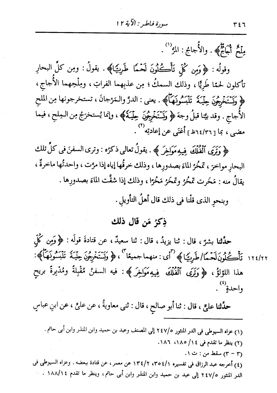 ذِكْرُ مَنْ قَالَ ذَلِكَ: حَدَّثَنَا بِشْرٌ، قَالَ: ثنا يَزِيدُ، قَالَ: ثنا سَعِيدٌ، عَنْ قَتَادَةَ، قَوْلُهُ: {§وَمِنْ كُلٍّ تَأْكُلُونَ لَحْمًا طَرِيًّا} [فاطر: 12] " أَيْ مِنْهُمَا جَمِيعًا {وَتَسْتَخْرِجُونَ حِلْيَةً تَلْبَسُونَهَا} [فاطر: 12] هَذَا اللُّؤْلُؤُ، {وَتَرَى الْفُلْكَ فِيهِ مَوَاخِرَ} [فاطر: 12] فِيهِ السُّفُنُ مُقْبِلَةً وَمُدْبِرَةً بِرِيحٍ وَاحِدَةٍ "