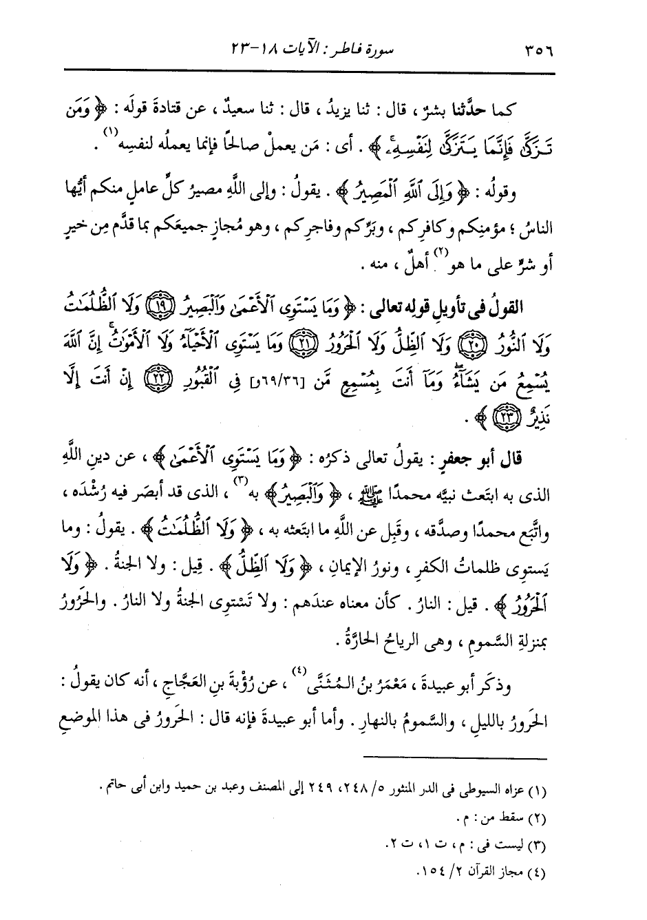 §الْقَوْلُ فِي تَأْوِيلِ قَوْلِهِ تَعَالَى: {وَمَا يَسْتَوِي الْأَعْمَى وَالْبَصِيرُ وَلَا الظُّلُمَاتُ وَلَا النُّورُ وَلَا الظِّلُّ وَلَا الْحَرُورُ وَمَا يَسْتَوِي الْأَحْيَاءُ وَلَا الْأَمْوَاتُ إِنَّ اللَّهَ يُسْمِعُ مَنْ يَشَاءُ وَمَا أَنْتَ بِمُسْمِعٍ مَنْ فِي الْقُبُورِ إِنْ أَنْتَ إِلَّا نَذِيرٌ} [فاطر: 20] يَقُولُ تَعَالَى ذِكْرُهُ: {وَمَا يَسْتَوِي الْأَعْمَى} [فاطر: 19] عَنْ دَيْنِ اللَّهِ الَّذِي ابْتَعَثَ بِهِ نَبِيَّهُ مُحَمَّدًا صَلَّى اللهُ عَلَيْهِ وَسَلَّمَ {وَالْبَصِيرُ} [الأنعام: 50] الَّذِي قَدْ أَبْصَرَ فِيهِ رُشْدَهُ، فَاتَّبَعَ مُحَمَّدًا وَصَدَّقَهُ، وَقَبِلَ عَنِ اللَّهِ مَا ابْتَعَثَهُ بِهِ {وَلَا الظُّلُمَاتُ وَلَا النُّورُ} [فاطر: 20] يَقُولُ: وَمَا تَسْتَوِي ظُلُمَاتُ الْكُفْرِ، وَنُورُ الْإِيمَانِ، {وَلَا الظِّلُّ} [فاطر: 21] قِيلَ: وَلَا الْجَنَّةُ {وَلَا الْحَرُورُ} [فاطر: 21] قِيلَ: النَّارُ، كَأَنَّ مَعْنَاهُ عِنْدَهُمْ: وَمَا تَسْتَوِي الْجَنَّةُ وَالنَّارُ؛ وَالْحَرُورُ بِمَنْزِلَةِ السِّمُومِ، وَهِيَ الرِّيَاحُ الْحَارَّةُ وَذَكَرَ أَبُو عُبَيْدَةَ مَعْمَرُ بْنُ الْمُثَنَّى، عَنْ رُؤْبَةَ بْنِ الْعَجَّاجِ، أَنَّهُ كَانَ يَقُولُ: الْحَرُورُ بِاللَّيْلِ، وَالسَّمُومُ بِالنَّهَارِ وَأَمَّا أَبُو عُبَيْدَةَ فَإِنَّهُ قَالَ: الْحَرُورُ فِي هَذَا الْمَوْضِعِ