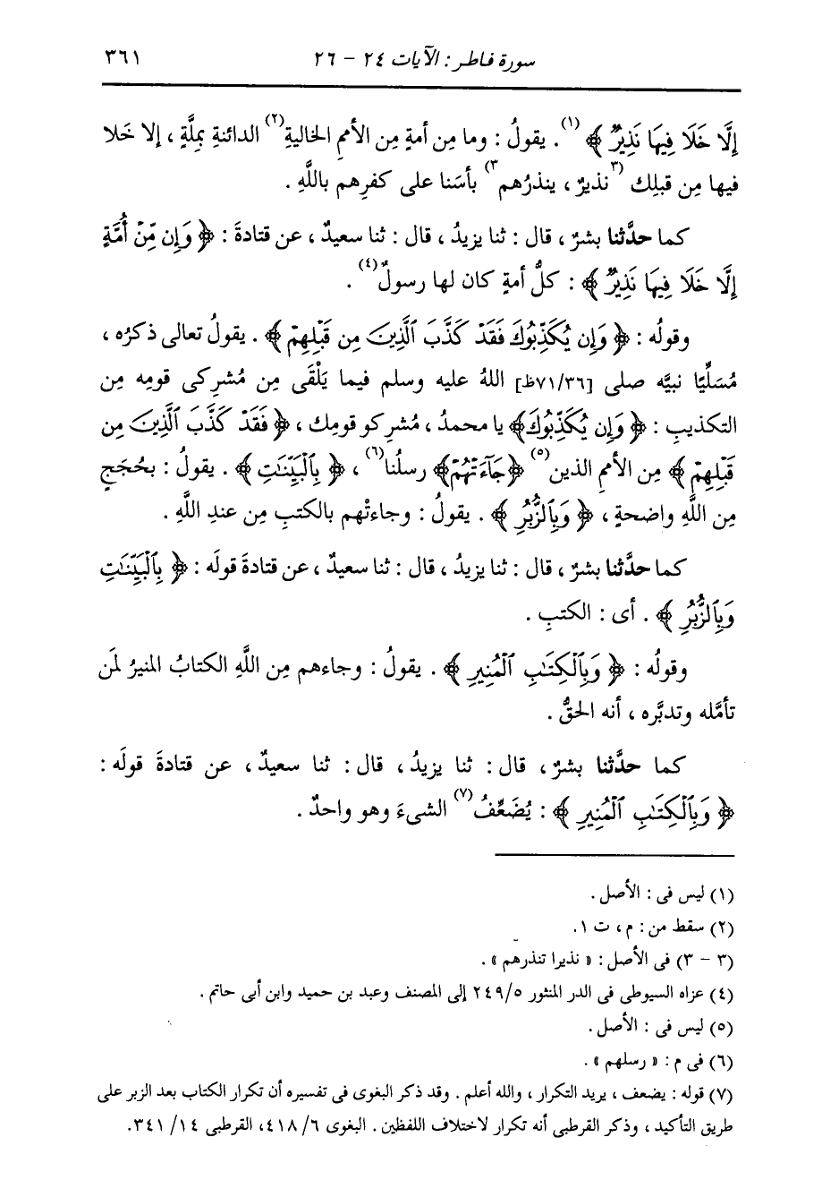 كَمَا حَدَّثَنَا بِشْرٌ، قَالَ: ثنا يَزِيدُ، قَالَ: ثنا سَعِيدٌ، عَنْ قَتَادَةَ، قَوْلُهُ: {§وَبِالْكِتَابِ الْمُنِيرِ} [فاطر: 25] «يُضَعِّفُ الشَّيْءَ وَهُوَ وَاحِدٌ»