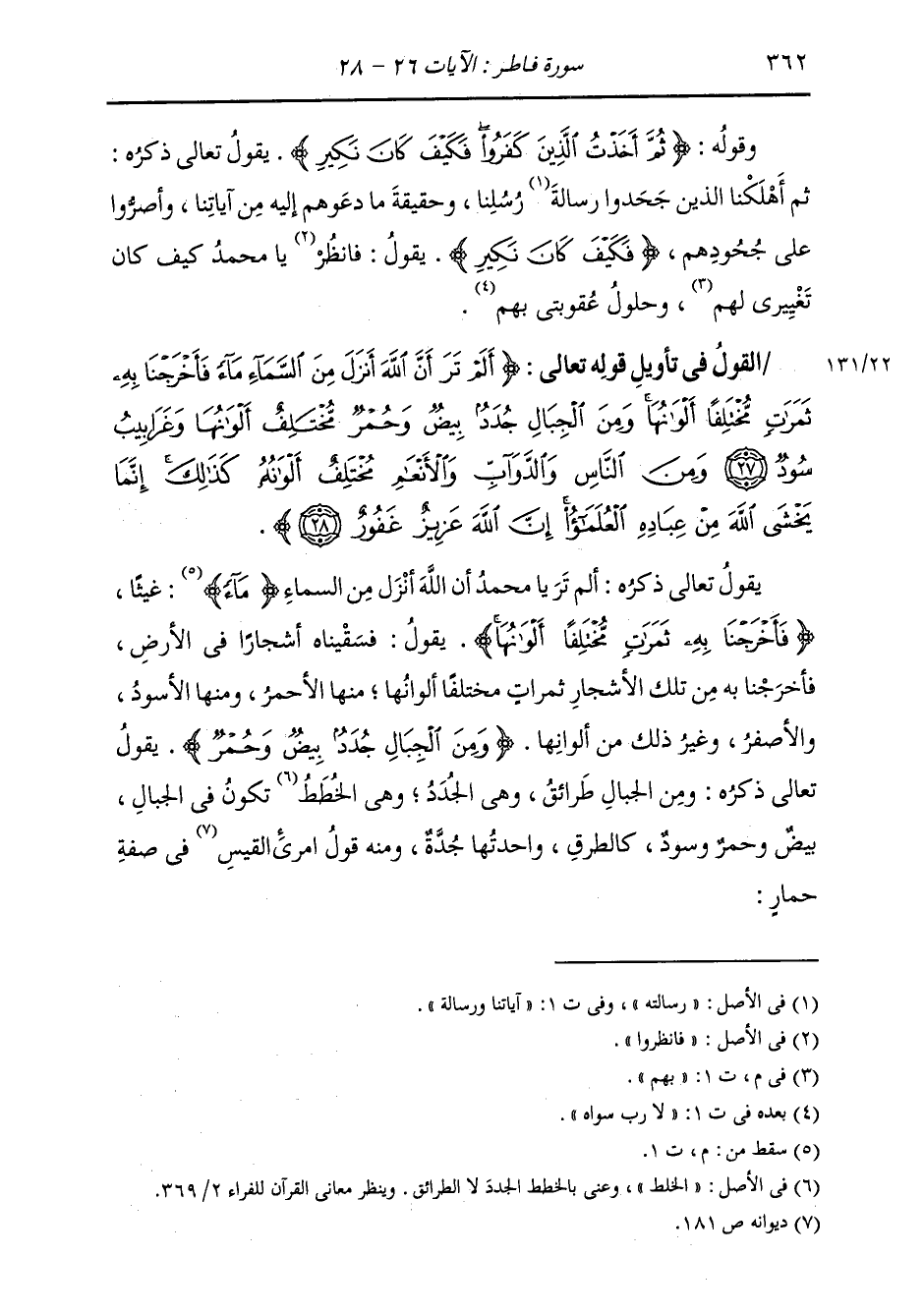 §الْقَوْلُ فِي تَأْوِيلِ قَوْلِهِ تَعَالَى: {أَلَمْ تَرَ أَنَّ اللَّهَ أَنْزَلَ مِنَ السَّمَاءِ مَاءً فَأَخْرَجْنَا بِهِ ثَمَرَاتٍ مُخْتَلِفًا أَلْوَانُهَا وَمِنَ الْجِبَالِ جُدَدٌ بِيضٌ وَحُمْرٌ مُخْتَلِفٌ أَلْوَانُهَا وَغَرَابِيبُ سُودٌ وَمِنَ النَّاسِ وَالدَّوَابِّ وَالْأَنْعَامِ مُخْتَلِفٌ أَلْوَانُهُ كَذَلِكَ إِنَّمَا يَخْشَى اللَّهَ مِنْ عِبَادِهِ الْعُلَمَاءُ إِنَّ اللَّهَ عَزِيزٌ غَفُورٌ} [فاطر: 28] يَقُولُ تَعَالَى ذِكْرُهُ: أَلَمْ تَرَ يَا مُحَمَّدُ أَنَّ اللَّهَ أَنْزَلَ مِنَ السَّمَاءِ غَيْثًا، فَأُخْرِجْنَا بِهِ ثَمَرَاتٍ مُخْتَلِفًا أَلْوَانُهَا؛ يَقُولُ: فَسَقَيْنَاهُ أَشْجَارًا فِي الْأَرْضِ، فَأُخْرِجْنَا بِهِ مِنْ تِلْكِ الْأَشْجَارِ ثَمَرَاتٍ مُخْتَلِفًا أَلْوَانُهَا، مِنْهَا الْأَحْمَرُ، وَمِنْهَا الْأَسْوَدُ وَالْأَصْفَرُ، وَغَيْرُ ذَلِكَ مِنْ أَلْوَانِهَا {وَمِنَ الْجِبَالِ جُدُدٌّ بِيضٌ وَحُمْرٌ} [فاطر: 27] يَقُولُ تَعَالَى ذِكْرُهُ: وَمِنَ الْجِبَالِ طَرَائِقُ، وَهِيَ الْجُدُدُ، وَهِيَ الْخُطَطُ تَكُونُ فِي الْجِبَالِ بِيضٌ وَحُمْرٌ وَسُودٌ، كَالطُّرُقْ؛ وَاحِدَتُهَا جُدَّةٌ؛ وَمِنْهُ قَوْلُ امْرِئِ الْقَيْسِ فِي صِفَةِ حِمَارٍ: