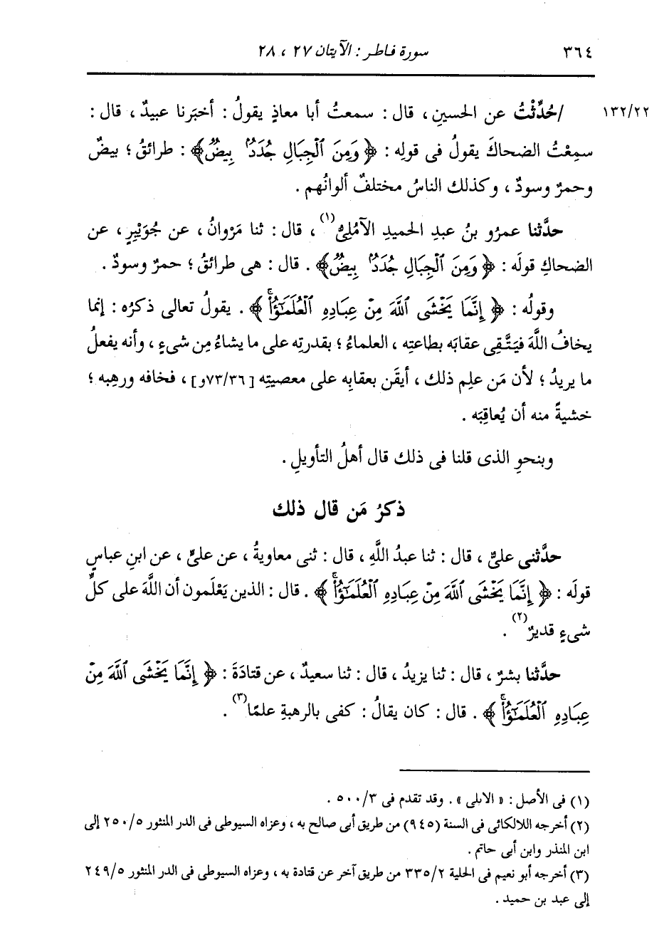 §وَقَوْلُهُ: {إِنَّمَا يَخْشَى اللَّهَ مِنْ عِبَادِهِ الْعُلَمَاءُ} [فاطر: 28] يَقُولُ تَعَالَى ذِكْرُهُ: إِنَّمَا يَخَافُ اللَّهَ فَيَتَّقِي عِقَابَهُ بِطَاعَتِهِ الْعُلَمَاءُ، بِقُدْرَتِهِ عَلَى مَا يَشَاءُ مِنْ شَيْءٍ، وَأَنَّهُ يَفْعَلُ مَا يُرِيدُ، لِأَنَّ مَنْ عَلِمَ ذَلِكَ أَيْقَنَ بِعِقَابِهِ عَلَى مَعْصِيَتِهِ، فَخَافَهُ وَرَهِبَهُ خَشْيَةً مِنْهُ أَنْ يُعَاقِبَهُ وَبِنَحْوِ الَّذِي قُلْنَا فِي ذَلِكَ قَالَ أَهْلُ التَّأْوِيلِ