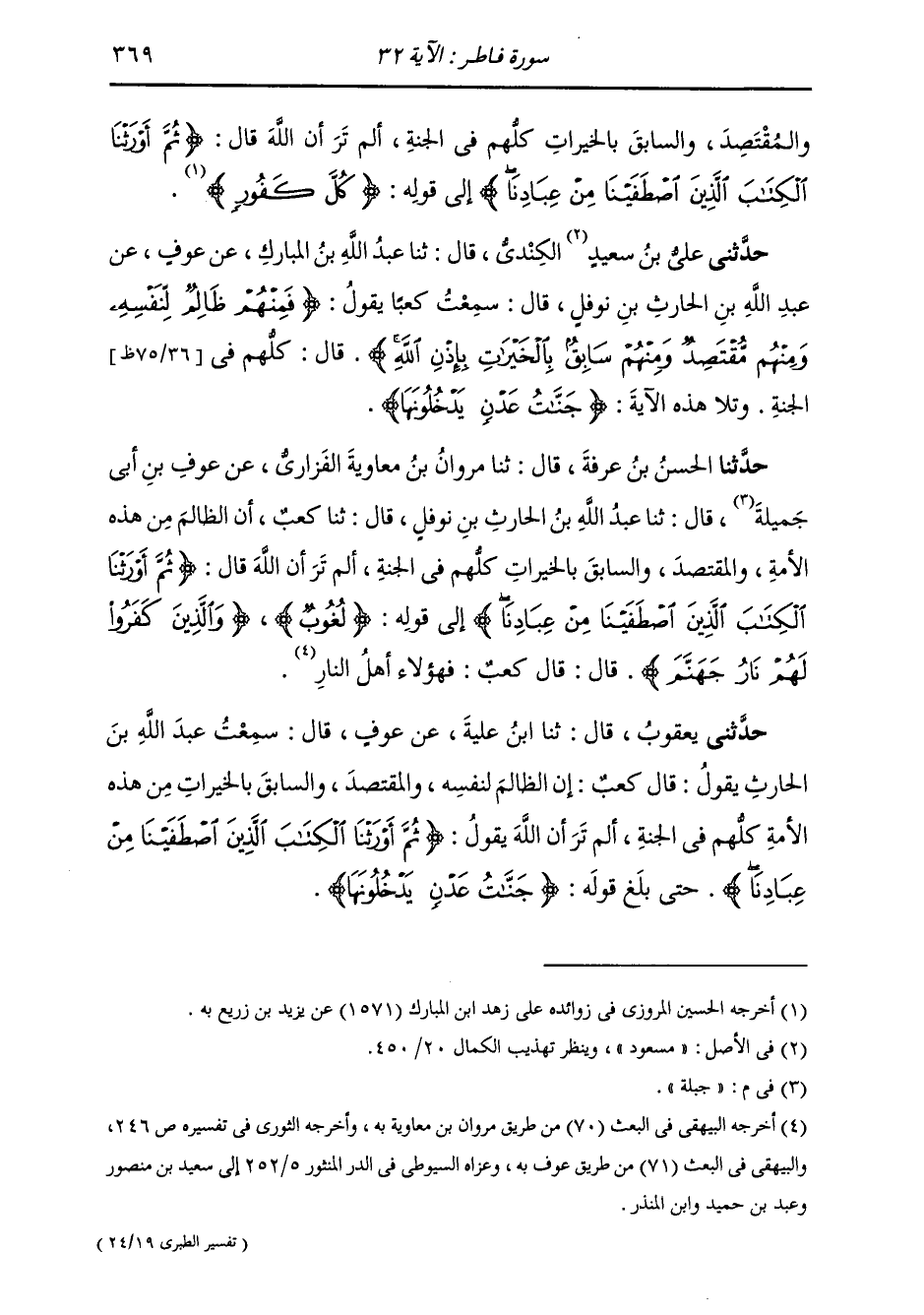 حَدَّثَنَا الْحَسَنُ بْنُ عَرَفَةَ، قَالَ: ثنا مَرْوَانُ بْنُ مُعَاوِيَةَ الْفَزَارِيُّ، عَنْ عَوْفِ بْنِ أَبِي جَبَلَةَ، قَالَ: ثنا عَبْدُ اللَّهِ بْنُ الْحَارِثِ بْنِ نَوْفَلٍ، قَالَ: ثنا كَعْبٌ، أَنَّ §الظَّالِمَ مِنْ هَذِهِ الْأُمَّةِ، وَالْمُقْتَصِدَ، وَالسَّابِقَ بِالْخَيْرَاتِ كُلَّهُمْ فِي الْجَنَّةِ؛ أَلَمْ تَرَ أَنَّ اللَّهَ قَالَ: {ثُمَّ أَوْرَثْنَا الْكِتَابَ الَّذِينَ اصْطَفَيْنَا مِنْ عِبَادِنَا} [فاطر: 32] إِلَى قَوْلِهِ: {لُغُوبِ} [فاطر: 35] وَالَّذِينَ كَفَرُوا لَهُمْ نَارُ جَهَنَّمَ، قَالَ: قَالَ كَعْبٌ: «فَهَؤُلَاءِ أَهْلُ النَّارِ»