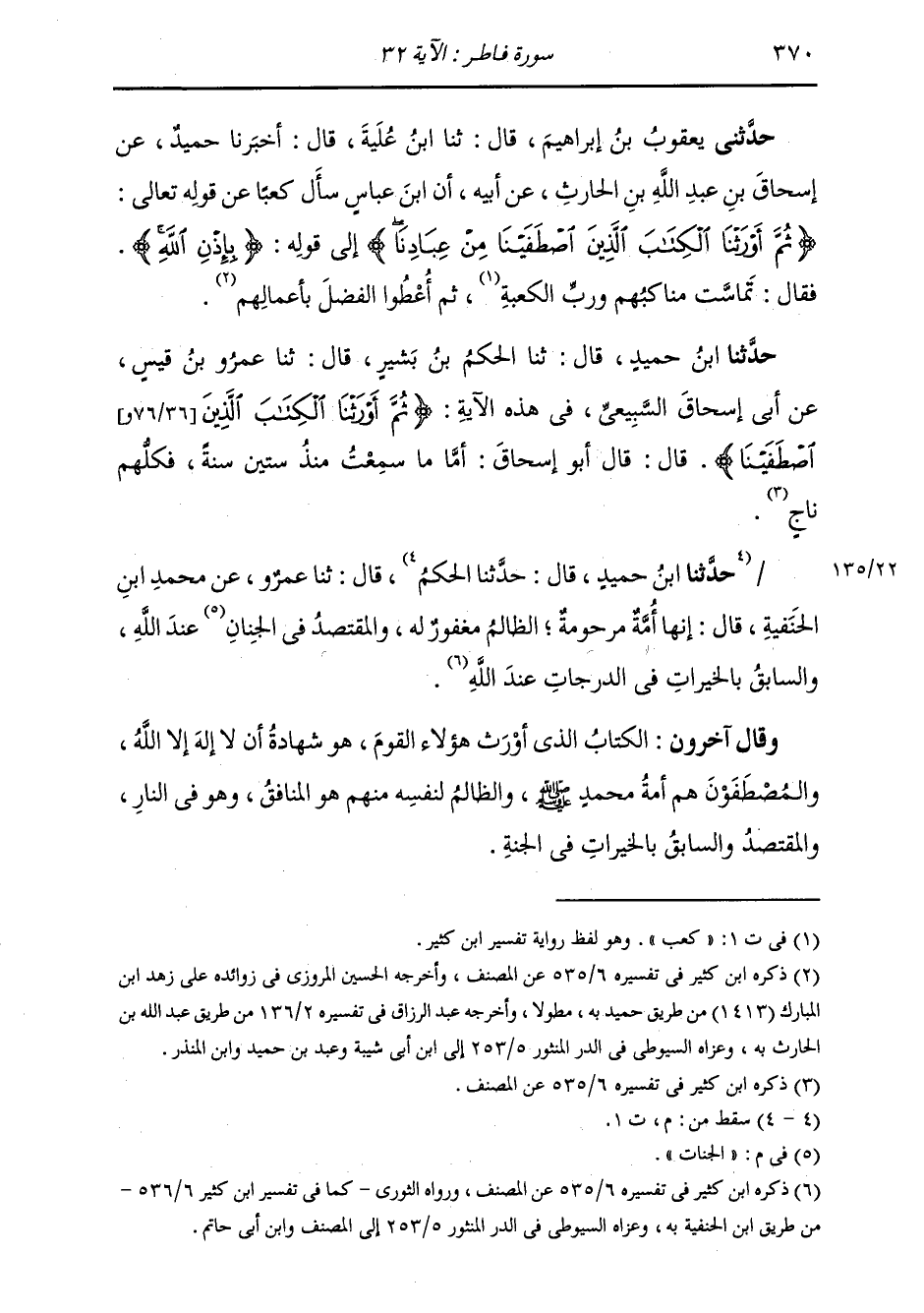 حَدَّثَنِي يَعْقُوبُ بْنُ إِبْرَاهِيمَ، قَالَ: ثنا ابْنُ عُلَيَّةَ، قَالَ: أَخْبَرَنَا حُمَيْدٌ، عَنْ إِسْحَاقَ بْنِ عَبْدِ اللَّهِ بْنِ الْحَارِثِ، عَنْ أَبِيهِ، أَنَّ ابْنَ عَبَّاسٍ، سَأَلَ كَعْبًا عَنْ قَوْلِهِ تَعَالَى: {§ثُمَّ أَوْرَثْنَا الْكِتَابَ الَّذِينَ اصْطَفَيْنَا مِنْ عِبَادِنَا} [فاطر: 32] إِلَى قَوْلِهِ: {بِإِذْنِ اللَّهِ} [فاطر: 32] فَقَالَ: «تَمَاسَّتْ مَنَاكِبُهُمْ وَرَبِّ الْكَعْبَةِ، ثُمَّ أُعْطُوا الْفَضْلَ بِأَعْمَالِهِمْ»