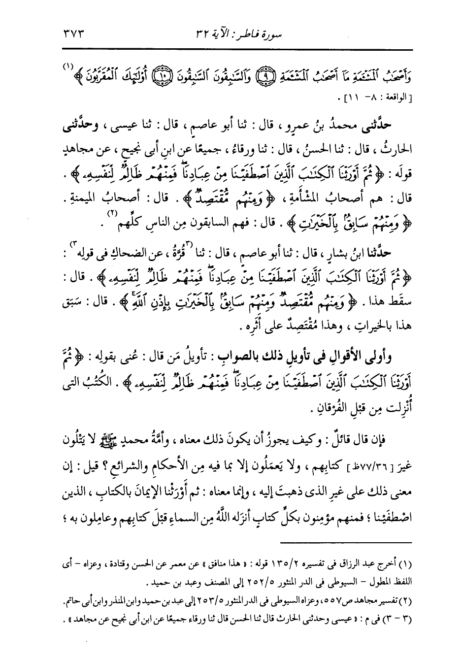 حَدَّثَنَا ابْنُ بَشَّارٍ، قَالَ: ثنا أَبُو عَاصِمٍ، قَالَ: ثنا عِيسَى؛ وَحَدَّثَنِي الْحَارِثُ، قَالَ: ثنا الْحَسَنُ، قَالَ: ثنا وَرْقَاءُ، جَمِيعًا عَنِ ابْنِ أَبِي نَجِيحٍ، عَنْ مُجَاهِدٍ: {§ثُمَّ أَوْرَثْنَا الْكِتَابَ الَّذِينَ اصْطَفَيْنَا مِنْ عِبَادِنَا فَمِنْهُمْ ظَالِمٌ لِنَفْسِهِ} [فاطر: 32] قَالَ: " سَقَطَ هَذَا {وَمِنْهُمْ مُقْتَصِدٌ وَمِنْهُمْ سَابِقٌ بِالْخَيْرَاتِ بِإِذْنِ اللَّهِ} [فاطر: 32] قَالَ: سَبَقَ هَذَا بِالْخَيْرَاتِ، وَهَذَا مُقْتَصِدٌ عَلَى أَثْرِهِ " وَأَوْلَى الْأَقْوَالِ فِي ذَلِكَ بِالصَّوَابِ تَأْوِيلُ مَنْ قَالَ: عَنَى بِقَوْلِهِ: {ثُمَّ أَوْرَثْنَا الْكِتَابَ الَّذِينَ اصْطَفَيْنَا مِنْ عِبَادِنَا} [فاطر: 32] الْكُتُبُ الَّتِي أُنْزِلَتْ مِنْ قَبْلِ الْفُرْقَانِ فَإِنْ قَالَ قَائِلٌ: وَكَيْفَ يَجُوزُ أَنْ يَكُونَ ذَلِكَ مَعْنَاهُ، وَأَمَةُ مُحَمَّدٍ صَلَّى اللهُ عَلَيْهِ وَسَلَّمَ لَا يَتْلُونَ غَيْرَ كِتَابِهِمْ، وَلَا يَعْمَلُونَ إِلَّا بِمَا فِيهِ مِنَ الْأَحْكَامِ وَالشَّرَائِعِ؟ قِيلَ: إِنَّ مَعْنَى ذَلِكَ عَلَى غَيْرِ الَّذِي ذَهَبْتُ إِلَيْهِ، وَإِنَّمَا مَعْنَاهُ: ثُمَّ أَوْرَثْنَا الْإِيمَانَ بِالْكِتَابِ الَّذِينَ اصْطَفَيْنَا، فَمِنْهُمْ مُؤْمِنُونَ بِكُلِّ كِتَابٍ أَنْزَلَهُ اللَّهُ مِنَ السَّمَاءِ قَبْلَ كِتَابِهِمْ وَعَامِلُونَ بِهِ، -[374]- لِأَنَّ كُلَّ كِتَابٍ أُنْزِلَ مِنَ السَّمَاءِ قَبْلَ الْفُرْقَانِ، فَإِنَّهُ يَأْمُرُ بِالْعَمَلِ بِالْفُرْقَانِ عِنْدَ نُزُولِهِ، وَبِاتِّبَاعِ مَنْ جَاءِ بِهِ، وَذَلِكَ عَمَلُ مَنْ أَقَرَّ بِمُحَمَّدٍ صَلَّى اللهُ عَلَيْهِ وَسَلَّمَ، وَبِمَا جَاءَ بِهِ، وَعَمِلَ بِمَا دَعَاهُ إِلَيْهِ بِمَا فِي الْقُرْآنِ، وَبِمَا فِي غَيْرِهِ مِنَ الْكُتُبِ الَّتِي أُنْزِلَتْ قَبْلَهُ وَإِنَّمَا قِيلَ: عَنَى بِقَوْلِهِ {ثُمَّ أَوْرَثْنَا الْكِتَابَ} [فاطر: 32] الْكُتُبَ الَّتِي ذَكَرْنَا لِأَنَّ اللَّهَ جَلَّ ثَنَاؤُهُ قَالَ لِنَبِيِّهِ مُحَمَّدٍ صَلَّى اللهُ عَلَيْهِ وَسَلَّمَ {وَالَّذِي أَوْحَيْنَا إِلَيْكَ مِنَ الْكِتَابِ هُوَ الْحَقُّ مُصَدِّقًا لِمَا بَيْنَ يَدَيْهِ} [فاطر: 31] ثُمَّ أَتْبَعَ ذَلِكَ قَوْلَهُ {ثُمَّ أَوْرَثْنَا الْكِتَابَ الَّذِينَ اصْطَفَيْنَا} [فاطر: 32] فَكَانَ مَعْلُومًا، إِذْ كَانَ مَعْنَى الْمِيرَاثِ إِنَّمَا هُوَ انْتِقَالُ مَعْنًى مِنْ قَوْمٍ إِلَى آخَرِينَ، وَلَمْ تَكُنْ أُمَّةٌ عَلَى عَهْدِ نَبِيِّنَا صَلَّى اللهُ عَلَيْهِ وَسَلَّمَ انْتَقَلَ إِلَيْهِمْ كِتَابٌ مِنْ قَوْمٍ كَانُوا قَبْلَهُمْ غَيْرَ أُمَّتِهِ، أَنَّ ذَلِكَ مَعْنَاهُ وَإِذْ كَانَ ذَلِكَ كَذَلِكَ، فَبَيَّنَ أَنَّ الْمُصْطَفِينَ مِنْ عِبَادِهِ هُمْ مُؤْمِنُو أُمَّتِهِ؛ وَأَمَّا الظَّالِمُ لِنَفْسِهِ، فَإِنَّهُ لِأَنْ يَكُونَ مِنْ أَهْلِ الذُّنُوبِ وَالْمَعَاصِي الَّتِي هِيَ دُونَ النِّفَاقِ وَالشِّرْكِ عِنْدِي أَشْبَهُ بِمَعْنَى الْآيَةِ مِنْ أَنْ يَكُونَ الْمُنَافِقَ أَوِ الْكَافِرَ، وَذَلِكَ أَنَّ اللَّهَ تَعَالَى ذِكْرُهُ أَتْبَعَ هَذِهِ الْآيَةَ قَوْلَهُ: {جَنَّاتُ عَدْنٍ يَدْخُلُونَهَا} [فاطر: 33] فَعَمَّ بِدُخُولِ الْجَنَّةِ جَمِيعَ الْأَصْنَافِ الثَّلَاثَةِ فَإِنْ قَالَ قَائِلٌ: فَإِنَّ قَوْلَهُ {يَدْخُلُونَهَا} [فاطر: 33] إِنَّمَا عَنَى بِهِ الْمُقْتَصِدَ وَالسَّابِقَ؛ قِيلَ لَهُ: وَمَا بُرْهَانُكَ عَلَى أَنَّ ذَلِكَ كَذَلِكَ مِنْ خَبَرٍ أَوْ عَقْلٍ؟ فَإِنْ قَالَ: قِيَامُ الْحُجَّةِ أَنَّ الظَّالِمَ مِنْ هَذِهِ الْأُمَّةِ سَيَدْخُلُ النَّارَ، وَلَوْ لَمْ يَدْخُلِ النَّارَ مِنْ هَذِهِ الْأَصْنَافِ الثَّلَاثَةِ أَحَدٌ وَجَبَ أَنْ لَا يَكُونَ لِأَهْلِ الْإِيمَانِ وَعِيدٌ؛ قِيلَ: إِنَّهُ لَيْسَ فِي الْآي