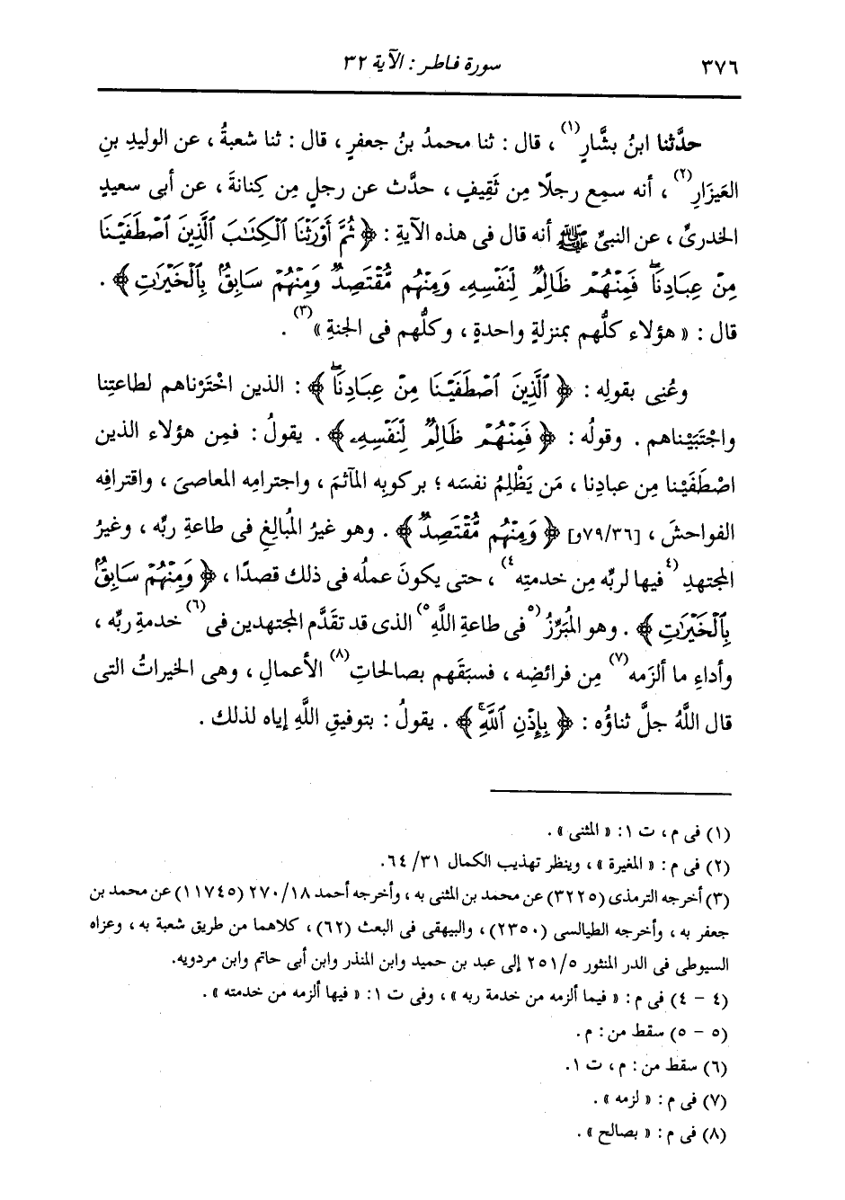 حَدَّثَنَا ابْنُ الْمُثَنَّى، قَالَ: ثنا مُحَمَّدُ بْنُ جَعْفَرٍ، قَالَ: ثنا شُعْبَةُ، عَنِ الْوَلِيدِ بْنِ الْمُغِيرَةِ، أَنَّهُ سَمِعَ رَجُلًا، مِنْ ثَقِيفَ حَدَّثَ عَنْ رَجُلٍ، مِنْ كِنَانَةَ، عَنْ أَبِي سَعِيدٍ الْخُدْرِيِّ، عَنِ النَّبِيِّ صَلَّى اللهُ عَلَيْهِ وَسَلَّمَ أَنَّهُ قَالَ فِي هَذِهِ الْآيَةِ: {§ثُمَّ أَوْرَثْنَا الْكِتَابَ الَّذِينَ اصْطَفَيْنَا مِنْ عِبَادِنَا فَمِنْهُمْ ظَالِمٌ لِنَفْسِهِ وَمِنْهُمْ مُقْتَصِدٌ وَمِنْهُمْ سَابِقٌ بِالْخَيْرَاتِ بِإِذْنِ اللَّهِ} [فاطر: 32] قَالَ: «وَهَؤُلَاءِ كُلُّهُمْ بِمَنْزِلَةٍ وَاحِدَةٍ، وَكُلُّهُمْ فِي الْجَنَّةِ» وَعَنِّي بِقَوْلِهِ: {الَّذِينَ اصْطَفَيْنَا مِنْ عِبَادِنَا} [فاطر: 32] الَّذِينَ اخْتَرْنَاهُمْ لِطَاعَتِنَا وَاجْتَبَيْنَاهُمْ
