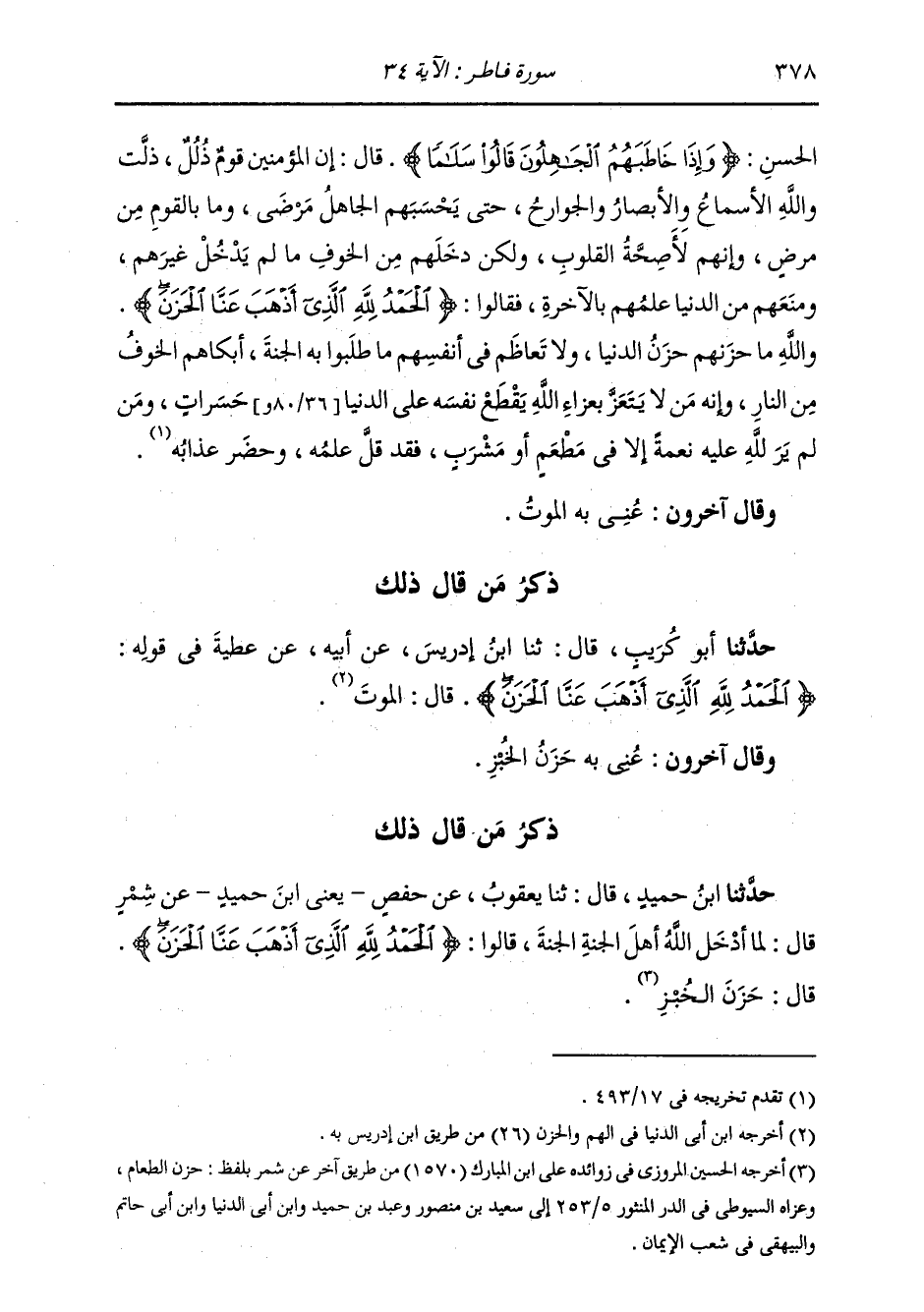 ذِكْرُ مَنْ قَالَ ذَلِكَ: حَدَّثَنَا أَبُو كُرَيْبٍ، قَالَ: ثنا ابْنُ إِدْرِيسَ، عَنْ أَبِيهِ، عَنْ عَطِيَّةَ، فِي قَوْلِهِ: {§الْحَمْدُ لِلَّهِ الَّذِي أَذْهَبَ عَنَّا الْحَزَنَ} [فاطر: 34] قَالَ: «الْمَوْتُ» وَقَالَ آخَرُونَ: عَنَى بِهِ حُزْنَ الْخُبْزِ