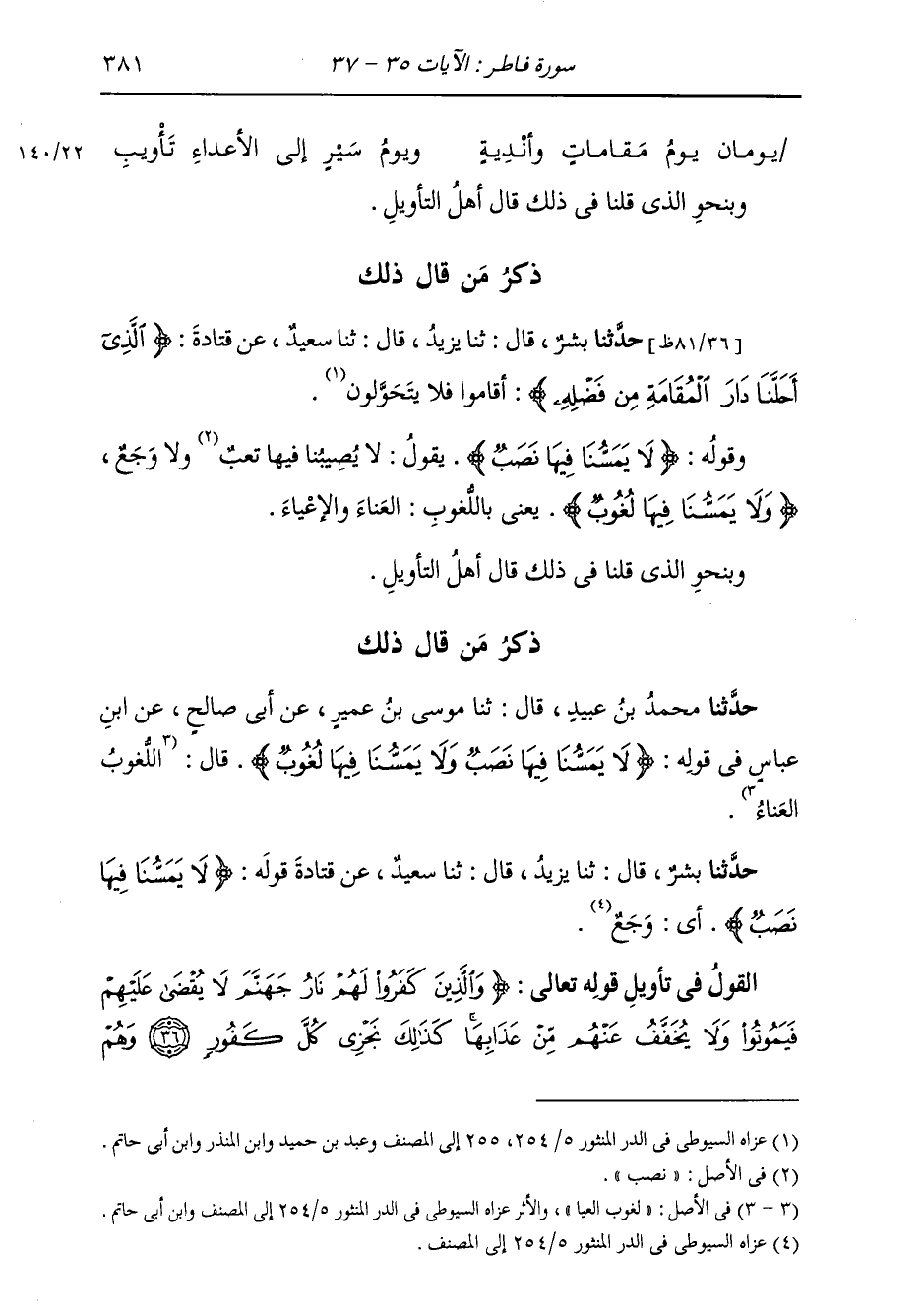 حَدَّثَنَا بِشْرٌ، قَالَ: ثنا يَزِيدُ، قَالَ: ثنا سَعِيدٌ، عَنْ قَتَادَةَ، قَوْلُهُ: {§لَا يَمَسُّنَا فِيهَا نَصَبٌ} [فاطر: 35] «أَيْ وَجَعٌ»