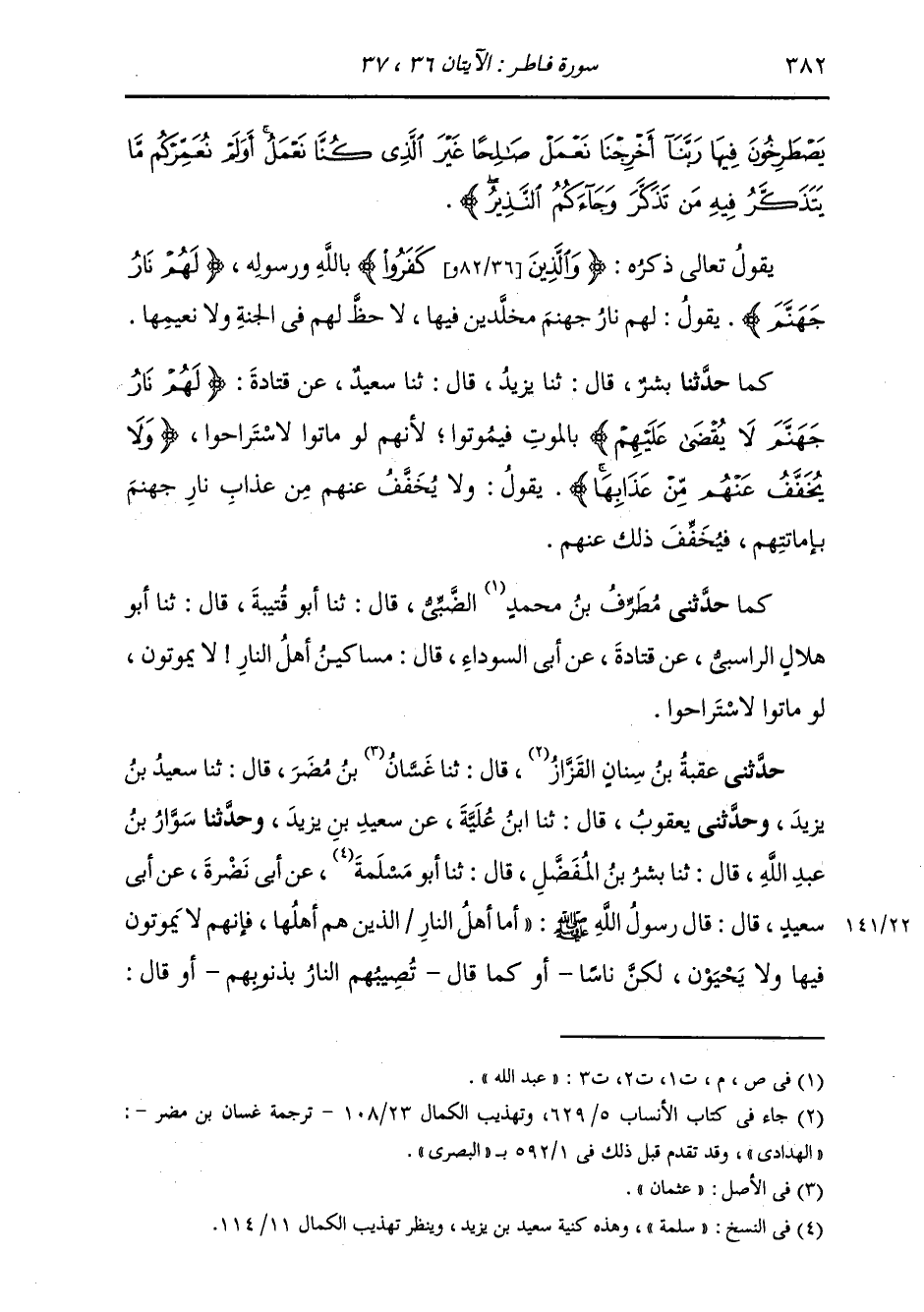 حَدَّثَنِي عُقْبَةُ، عَنْ سِنَانٍ الْقَزَّازِ، قَالَ: ثنا غَسَّانُ بْنُ مُضَرٍ، قَالَ: ثنا سَعِيدُ بْنُ يَزِيدَ، وَحَدَّثَنِي يَعْقُوبُ، قَالَ: ثنا ابْنُ عُلَيَّةَ، عَنْ سَعِيدِ بْنِ يَزِيدَ، وَحَدَّثَنَا سَوَّارُ بْنُ عَبْدِ اللَّهِ، قَالَ: ثنا بِشْرُ بْنُ الْمُفَضَّلِ، ثنا أَبُو سَلَمَةَ، عَنْ أَبِي نَضْرَةَ، عَنْ أَبِي سَعِيدٍ، قَالَ: قَالَ رَسُولُ اللَّهِ صَلَّى اللهُ عَلَيْهِ وَسَلَّمَ: " §أَمَا أَهْلُ النَّارِ الَّذِينَ هُمْ أَهْلُهَا فَإِنَّهُمْ لَا يَمُوتُونَ فِيهَا وَلَا يَحْيَوْنَ، لَكِنَّ نَاسًا أَوْ كَمَا قَالَ تُصِيبُهُمُ النَّارُ بِذُنُوبِهِمْ أَوْ قَالَ: -[383]- بِخَطَايَاهُمْ فَيُمِيتُهُمْ إِمَاتَةً حَتَّى إِذَا صَارُوا فَحْمًا أَذِنَ فِي الشَّفَاعَةِ، فَجِيءَ بِهِمْ ضَبَائِرَ ضَبَائِرَ، فَبُيُّوا عَلَى أَهْلِ الْجَنَّةِ، فَقَالَ: يَا أَهْلَ الْجَنَّةِ أَفِيضُوا عَلَيْهِمْ فَيَنْبُتُونَ كَمَا تَنْبُتُ الْحَبَّةُ فِي حَمِيلِ السَّيْلِ " فَقَالَ رَجُلٌ مِنَ الْقَوْمِ حِينَئِذٍ: كَأَنَّ رَسُولَ اللَّهِ صَلَّى اللهُ عَلَيْهِ وَسَلَّمَ قَدْ كَانَ بِالْبَادِيَةِ " فَإِنْ قَالَ قَائِلٌ: وَكَيْفَ قِيلَ: {وَلَا يُخَفَّفُ عَنْهُمْ مِنْ عَذَابِهَا} [فاطر: 36] وَقَدْ قِيلَ فِي مَوْضِعٍ آخَرَ: {كُلَّمَا خَبَتْ زِدْنَاهُمْ سَعِيرًا} [الإسراء: 97] ؟ قِيلَ: مَعْنَى ذَلِكَ: وَلَا يُخَفَّفُ عَنْهُمْ مِنْ هَذَا النَّوْعِ مِنَ الْعَذَابِ