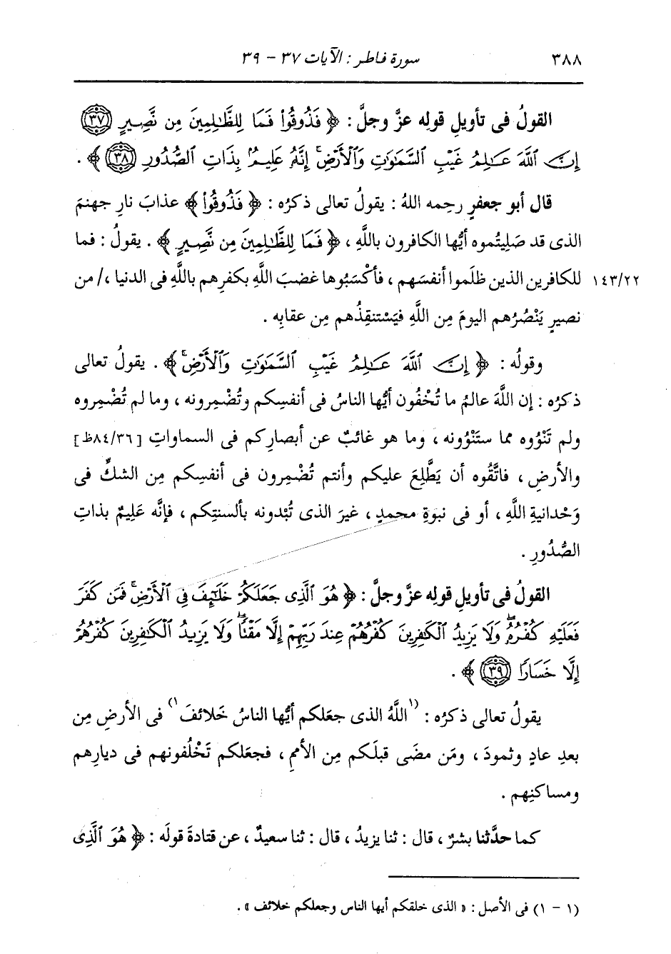 §الْقَوْلُ فِي تَأْوِيلِ قَوْلِهِ تَعَالَى: {هُوَ الَّذِي جَعَلَكُمْ خَلَائِفَ فِي الْأَرْضِ فَمَنْ كَفَرَ فَعَلَيْهِ كُفْرُهُ وَلَا يَزِيدُ الْكَافِرِينَ كُفْرُهُمْ عِنْدَ رَبِّهِمْ إِلَّا مَقْتًا وَلَا يَزِيدُ الْكَافِرِينَ كُفْرُهُمْ إِلَّا خَسَارًا} [فاطر: 39] يَقُولُ تَعَالَى ذِكْرُهُ: اللَّهُ الَّذِي جَعَلَكُمْ أَيُّهَا النَّاسُ خَلَائِفَ فِي الْأَرْضِ مِنْ بَعْدِ عَادٍ وَثَمُودَ، وَمَنْ مَضَى مِنْ قَبْلِكُمْ مِنَ الْأُمَمِ فَجَعَلَكُمْ تَخْلِفُونَهُمْ فِي دِيَارِهِمْ وَمَسَاكِنِهِمْ