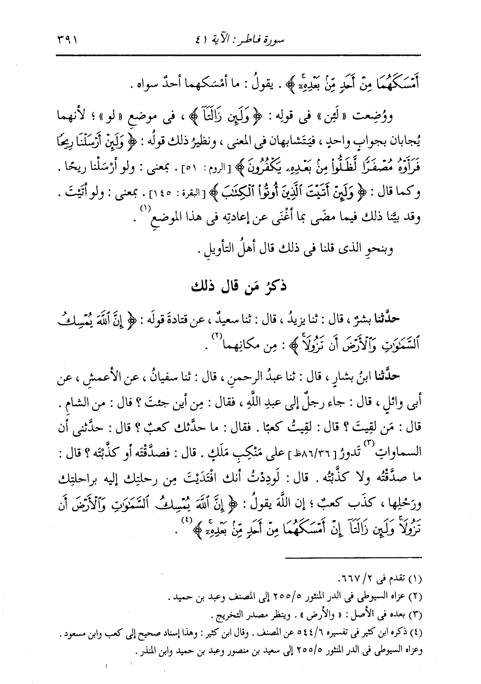 ذِكْرُ مَنْ قَالَ ذَلِكَ: حَدَّثَنَا بِشْرٌ، قَالَ: ثنا يَزِيدُ، قَالَ: ثنا سَعِيدٌ، عَنْ قَتَادَةَ، قَوْلُهُ: {§إِنَّ اللَّهَ يُمْسِكُ السَّمَوَاتِ وَالْأَرْضَ أَنْ تَزُولَا} «مِنْ مَكَانِهِمَا»