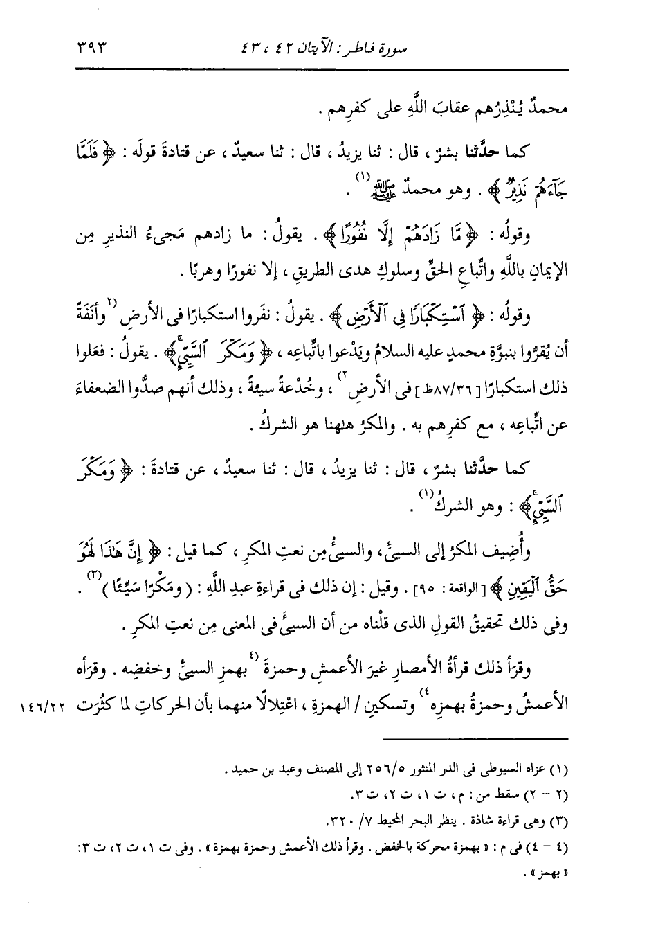كَمَا: حَدَّثَنَا بِشْرٌ، قَالَ: ثنا يَزِيدُ، قَالَ: ثنا سَعِيدٌ، عَنْ قَتَادَةَ: {§وَمَكْرَ السَّيِّئِ} [فاطر: 43] «وَهُوَ الشِّرْكُ» وَأُضِيفَ الْمَكْرُ إِلَى السَّيِّئِ، وَالسَّيِّئُ مِنْ نَعْتِ الْمَكْرِ، كَمَا قِيلَ: {إِنَّ هَذَا لَهُوَ حَقُّ الْيَقِينِ} [الواقعة: 95] وَقِيلَ: إِنَّ ذَلِكَ فِي قِرَاءَةِ عَبْدِ اللَّهِ: «مَكْرًا سَيِّئًا» ، وَفِي ذَلِكَ تَحْقِيقُ الْقَوْلِ الَّذِي قُلْنَاهُ مِنْ أَنَّ السَّيِّئَ فِي الْمَعْنَى مِنْ نَعْتِ الْمَكْرِ وَقَرَأَ ذَلِكَ قُرَّاءُ الْأَمْصَارِ غَيْرَ الْأَعْمَشِ وَحَمْزَةَ بِهَمْزَةٍ مُحَرَّكَةٍ بِالْخَفْضِ وَقَرَأَ ذَلِكَ الْأَعْمَشُ وَحَمْزَةُ بِهَمْزَةٍ وَتَسْكِينِ الْهَمْزَةِ اعْتِلَالًا مِنْهُمَا بِأَنَّ الْحَرَكَاتِ لَمَّا كَثُرَتْ
