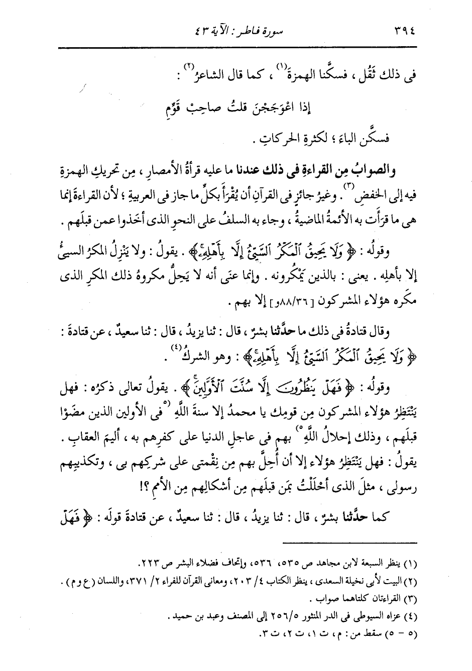 §وَقَوْلُهُ: {وَلَا يَحِيقُ الْمَكْرُ السَّيِّئُ إِلَّا بِأَهْلِهِ} [فاطر: 43] يَقُولُ: وَلَا يَنْزِلُ الْمَكْرُ السَّيِّئُ إِلَّا بِأَهْلِهِ، يَعْنِي بِالَّذِينَ يَمْكُرُونَهُ؛ وَإِنَّمَا عَنَى أَنَّهُ لَا يَحِلُّ مَكْرُوهُ ذَلِكَ الْمَكْرَ الَّذِي مَكَرَهُ هَؤُلَاءِ الْمُشْرِكُونَ إِلَّا بِهِمْ
