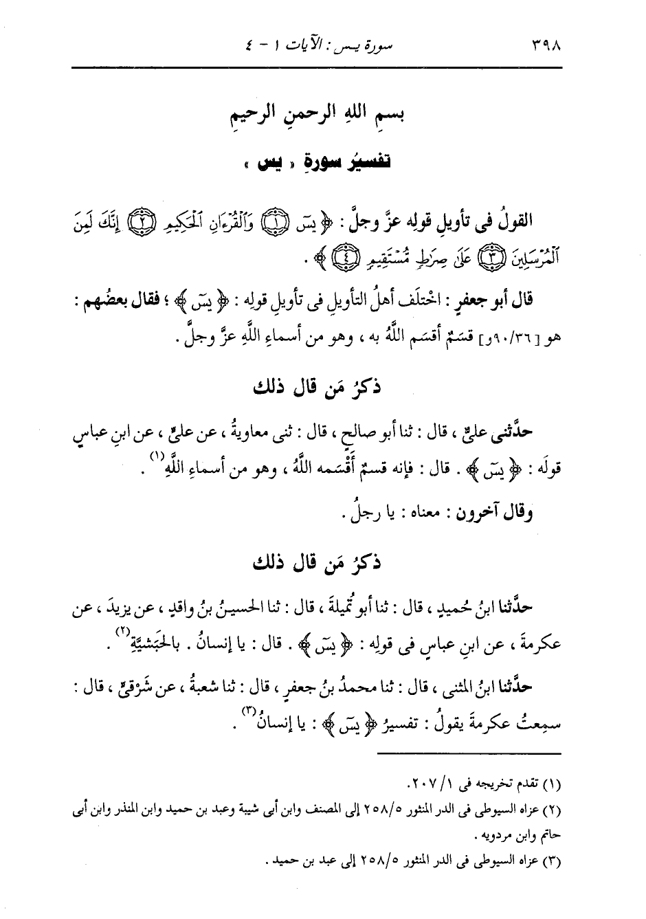 ذِكْرُ مَنْ قَالَ ذَلِكَ: حَدَّثَنِي عَلِيٌّ، قَالَ: ثنا أَبُو صَالِحٍ، قَالَ: ثني مُعَاوِيَةُ، عَنْ عَلِيٍّ، عَنِ ابْنِ عَبَّاسٍ، قَوْلُهُ: {§يس} [يس: 1] قَالَ: «فَإِنَّهُ قَسَمٌ أَقْسَمَهُ اللَّهُ، وَهُوَ مِنْ أَسْمَاءِ اللَّهِ» وَقَالَ آخَرُونَ: مَعْنَاهُ: يَا رَجُلُ