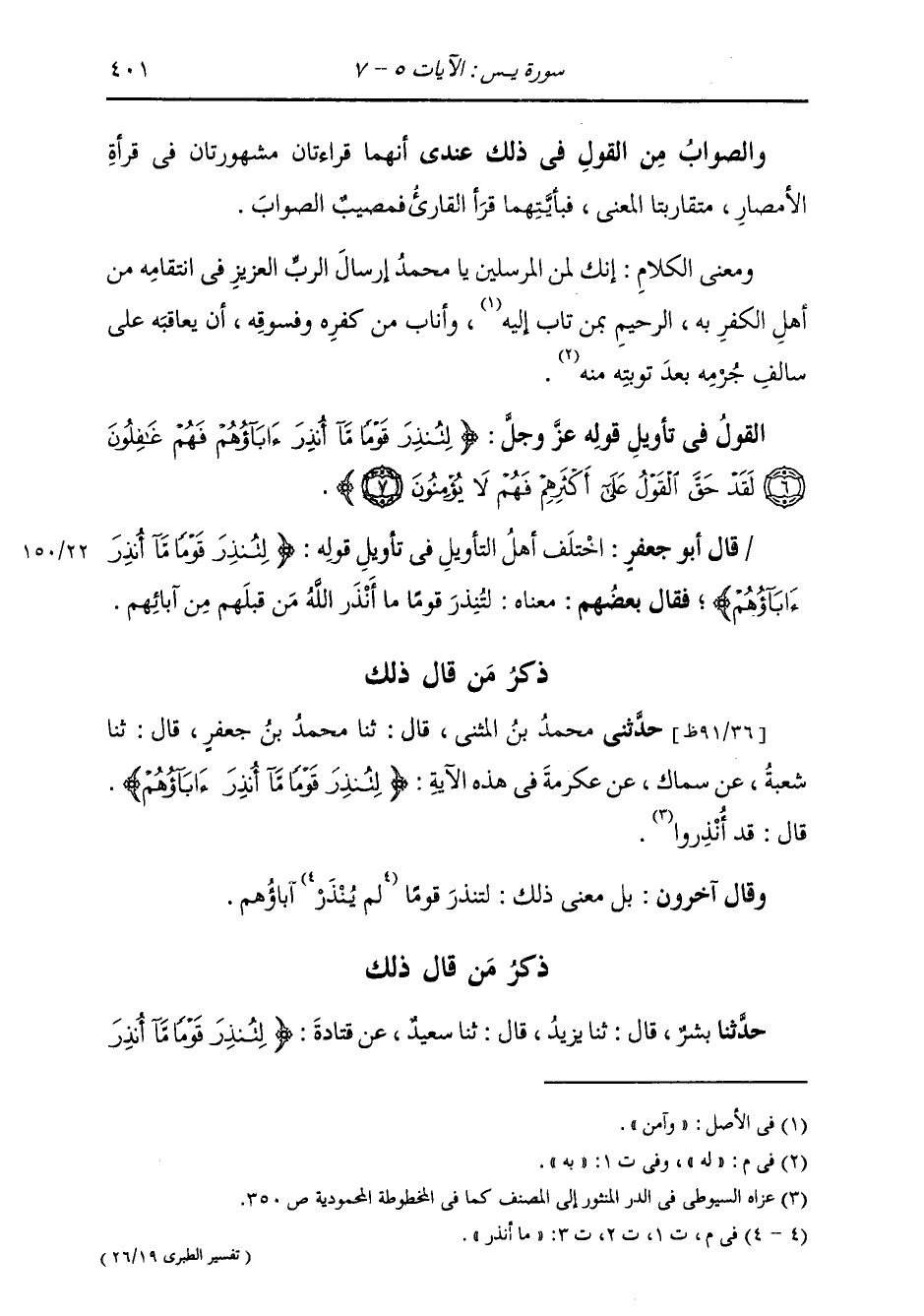 §الْقَوْلُ فِي تَأْوِيلِ قَوْلِهِ تَعَالَى: {لِتُنْذِرَ قَوْمًا مَا أُنْذِرَ آبَاؤُهُمْ فَهُمْ غَافِلُونَ لَقَدْ حَقَّ الْقَوْلُ عَلَى أَكْثَرِهِمْ فَهُمْ لَا يُؤْمِنُونَ} [يس: 7] اخْتَلَفَ أَهْلُ التَّأْوِيلِ فِي تَأْوِيلِ قَوْلِهِ: {لِتُنْذِرَ قَوْمًا مَا أُنْذِرَ آبَاؤُهُمْ} [يس: 6] فَقَالَ بَعْضُهُمْ: مَعْنَاهُ: لِتُنْذِرَ قَوْمًا مَا أَنْذَرَ اللَّهُ مِنْ قَبْلِهِمْ مِنْ آبَائِهِمْ
