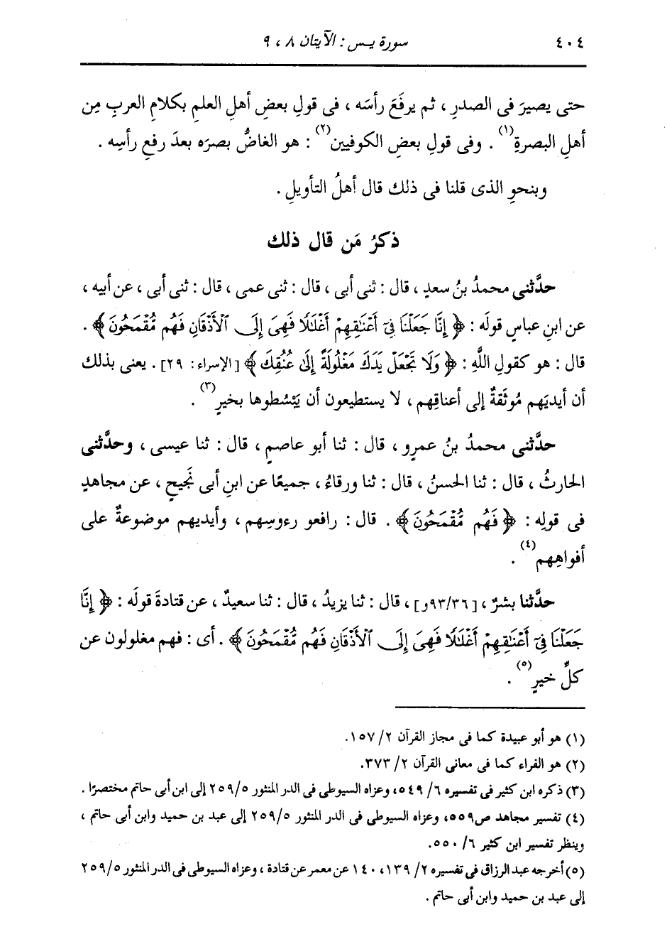 ذِكْرُ مَنْ قَالَ ذَلِكَ: حَدَّثَنِي مُحَمَّدُ بْنُ سَعْدٍ، قَالَ: ثني أَبِي، قَالَ: ثني عَمِّي، قَالَ: ثني أَبِي، عَنْ أَبِيهِ، عَنِ ابْنِ عَبَّاسٍ، قَوْلُهُ: {§إِنَّا جَعَلْنَا فِي أَعْنَاقِهِمْ أَغْلَالًا فَهِيَ إِلَى الْأَذْقَانِ فَهُمْ مُقْمَحُونَ} [يس: 8] قَالَ: " هُوَ كَقَوْلِ اللَّهِ: {وَلَا تَجْعَلْ يَدَكَ مَغْلُولَةً إِلَى عُنُقِكَ} [الإسراء: 29] يَعْنِي بِذَلِكَ أَنَّ أَيْدِيَهُمْ مُوثَقَةٌ إِلَى أَعْنَاقِهِمْ، لَا يَسْتَطِيعُونَ أَنْ يَبْسِطُوهَا بِخَيْرٍ "