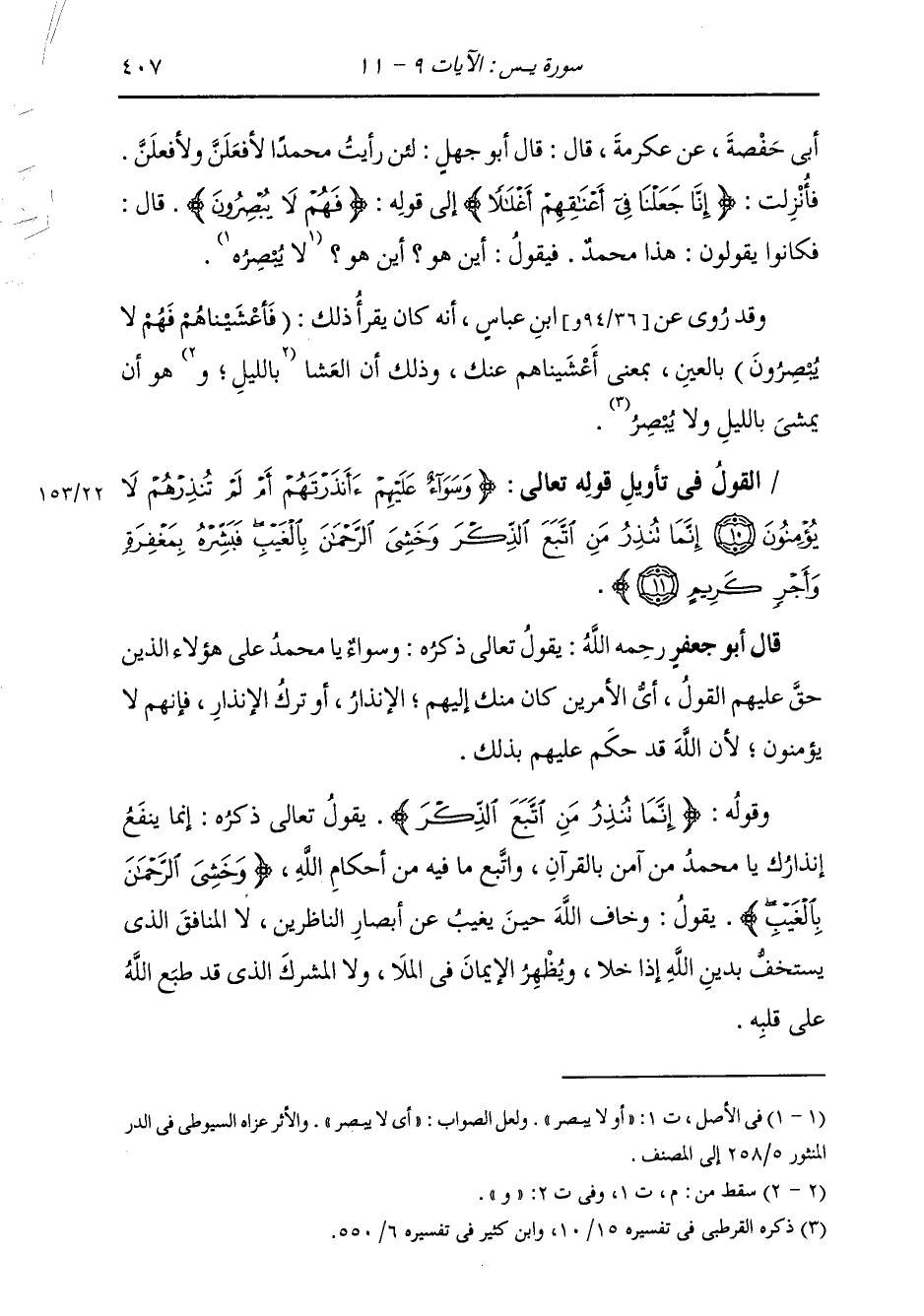 §الْقَوْلُ فِي تَأْوِيلِ قَوْلِهِ تَعَالَى: {وَسَوَاءٌ عَلَيْهِمْ أَأَنْذَرْتَهُمْ أَمْ لَمْ تُنْذِرْهُمْ لَا يُؤْمِنُونَ إِنَّمَا تُنْذِرُ مَنِ اتَّبَعَ الذِّكْرَ وَخَشِيَ الرَّحْمَنَ بِالْغَيْبِ فَبَشِّرْهُ بِمَغْفِرَةٍ وَأَجْرٍ كَرِيمٍ} [يس: 11] يَقُولُ تَعَالَى ذِكْرُهُ: وَسَوَاءٌ يَا مُحَمَّدُ عَلَى هَؤُلَاءِ الَّذِينَ حَقَّ عَلَيْهِمُ الْقَوْلُ، أَيِ الْأَمْرَيْنِ كَانَ مِنْكَ إِلَيْهِمُ الْإِنْذَارُ، أَوْ تَرْكُ الْإِنْذَارِ، فَإِنَّهُمْ لَا يُؤْمِنُونَ، لِأَنَّ اللَّهَ قَدْ حَكَمَ عَلَيْهِمْ بِذَلِكَ