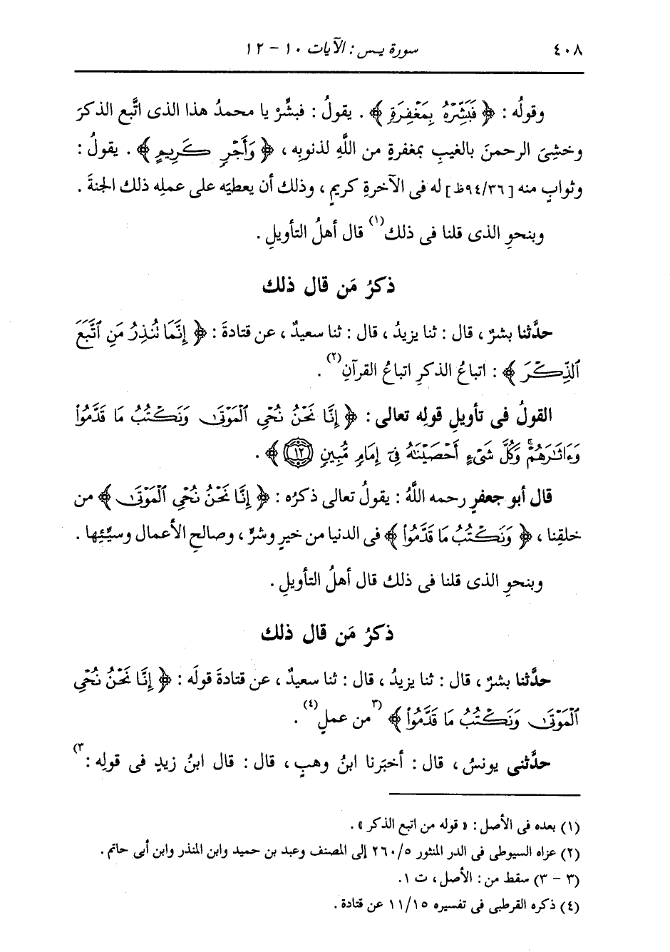 ذِكْرُ مَنْ قَالَ ذَلِكَ: حَدَّثَنَا بِشْرٌ، قَالَ: ثنا يَزِيدُ، قَالَ: ثنا سَعِيدٌ، عَنْ قَتَادَةَ، قَوْلُهُ: {§إِنَّا نَحْنُ نُحْيِي الْمَوْتَى وَنَكْتُبُ مَا قَدَّمُوا} [يس: 12] مِنْ عَمَلٍ "