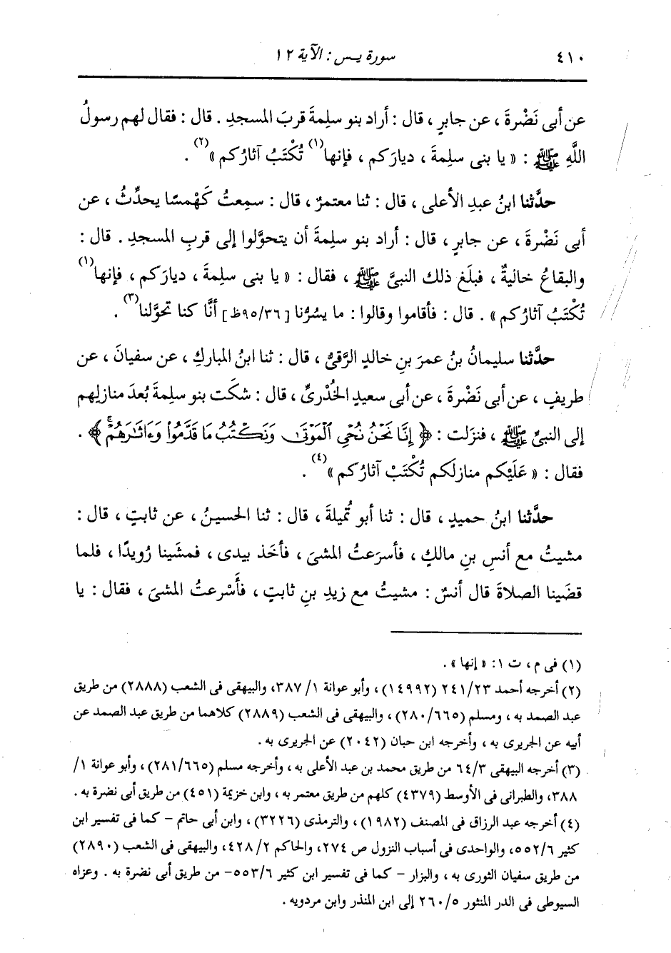 حَدَّثَنَا سُلَيْمَانُ بْنُ عُمَرَ بْنِ خَالِدٍ الرَّقِّيُّ، قَالَ: ثنا ابْنُ الْمُبَارَكِ، عَنْ سُفْيَانَ، عَنْ طَرِيفٍ، عَنْ أَبِي نَضْرَةَ، عَنْ أَبِي سَعِيدٍ الْخُدْرِيِّ، قَالَ: شَكَتْ بَنُو سَلَمَةَ بُعْدَ مَنَازِلِهِمْ إِلَى النَّبِيِّ صَلَّى اللهُ عَلَيْهِ وَسَلَّمَ، فَنَزَلَتْ: {§إِنَّا نَحْنُ نُحْيِي الْمَوْتَى وَنَكْتُبُ مَا قَدَّمُوا وَآثَارَهُمْ} [يس: 12] فَقَالَ: «عَلَيْكُمْ مَنَازِلَكُمْ تُكْتَبُ آثَارُكُمْ»