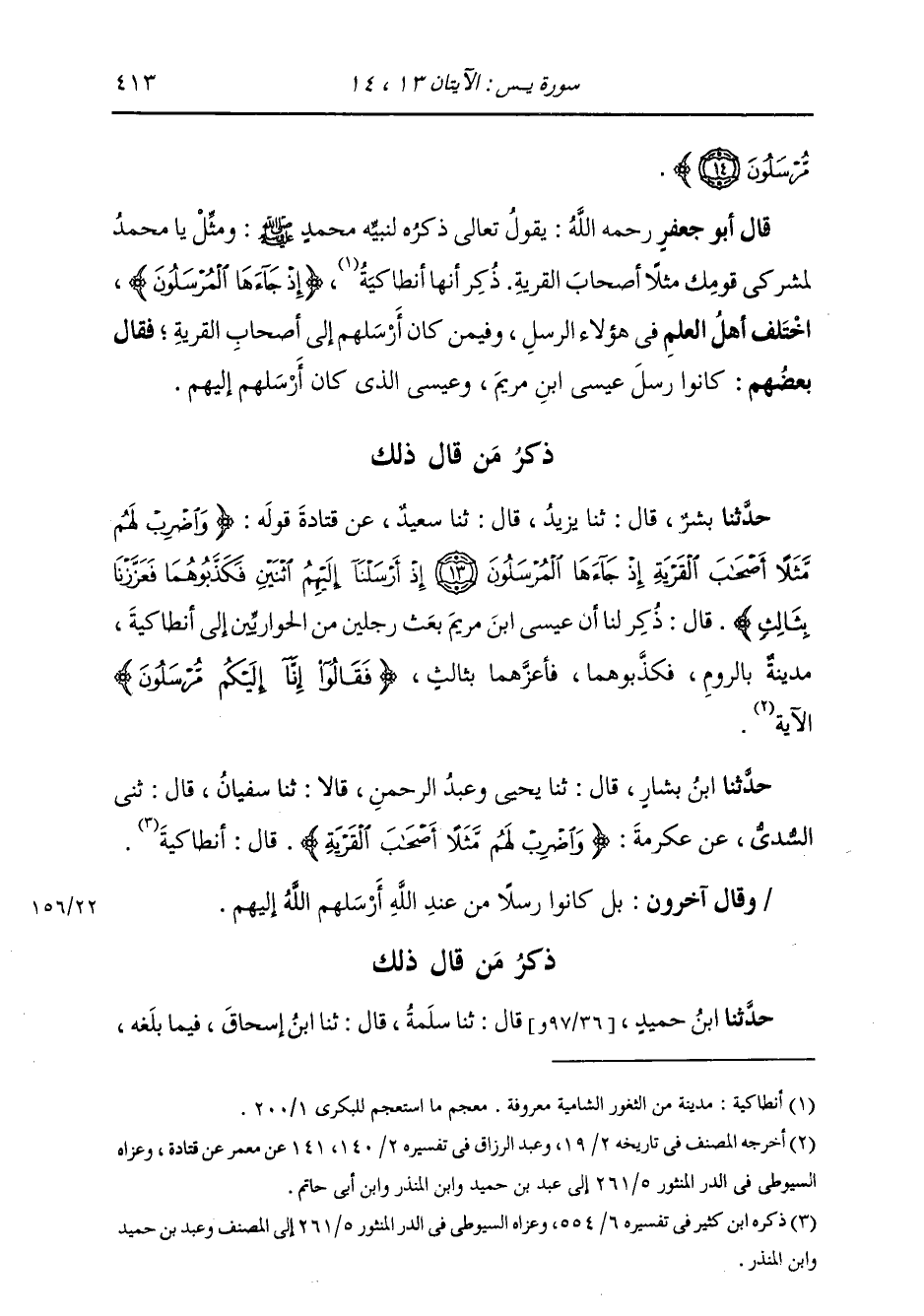 حَدَّثَنَا ابْنُ بَشَّارٍ، قَالَ: ثنا يَحْيَى، وَعَبْدُ الرَّحْمَنِ، قَالَا: ثنا سُفْيَانُ، قَالَ: ثني السُّدِّيُّ، عَنْ عِكْرِمَةَ {§وَاضْرِبْ لَهُمْ مَثَلًا أَصْحَابَ الْقَرْيَةِ} [يس: 13] قَالَ: «أَنْطَاكِيَّةُ» وَقَالَ آخَرُونَ: بَلْ كَانُوا رُسُلًا أَرْسَلَهُمُ اللَّهُ إِلَيْهِمْ