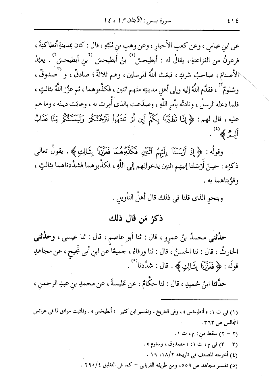 §وَقَوْلُهُ: {إِذْ أَرْسَلْنَا إِلَيْهِمُ اثْنَيْنِ فَكَذَّبُوهُمَا فَعَزَّزْنَا بِثَالِثٍ} [يس: 14] يَقُولُ تَعَالَى ذِكْرُهُ: حِينَ أَرْسَلْنَا إِلَيْهِمُ اثْنَيْنِ يَدْعُونَهُمْ إِلَى اللَّهِ فَكَذَّبُوهُمَا فَشَدَّدْنَاهُمَا بِثَالِثٍ، وَقَوَّيْنَاهُمَا بِهِ وَبِنَحْوِ الَّذِي قُلْنَا فِي ذَلِكَ قَالَ أَهْلُ التَّأْوِيلِ