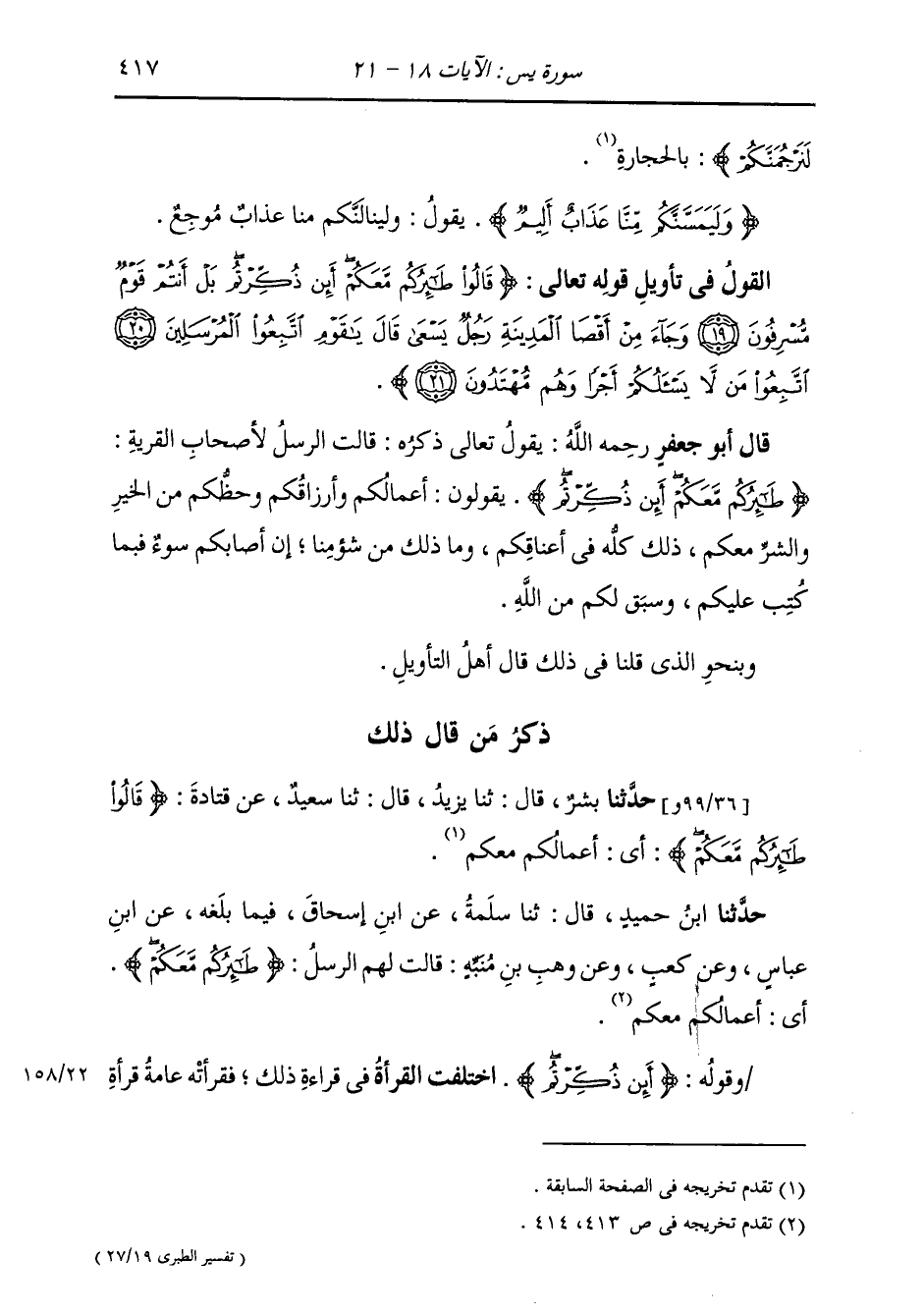 ذِكْرُ مَنْ قَالَ ذَلِكَ: حَدَّثَنَا بِشْرٌ، قَالَ: ثنا يَزِيدُ، قَالَ: ثنا سَعِيدٌ، عَنْ قَتَادَةَ، {قَالُوا طَائِرُكُمْ مَعَكُمْ} [يس: 19] «§أَيْ أَعْمَالُكُمْ مَعَكُمْ»