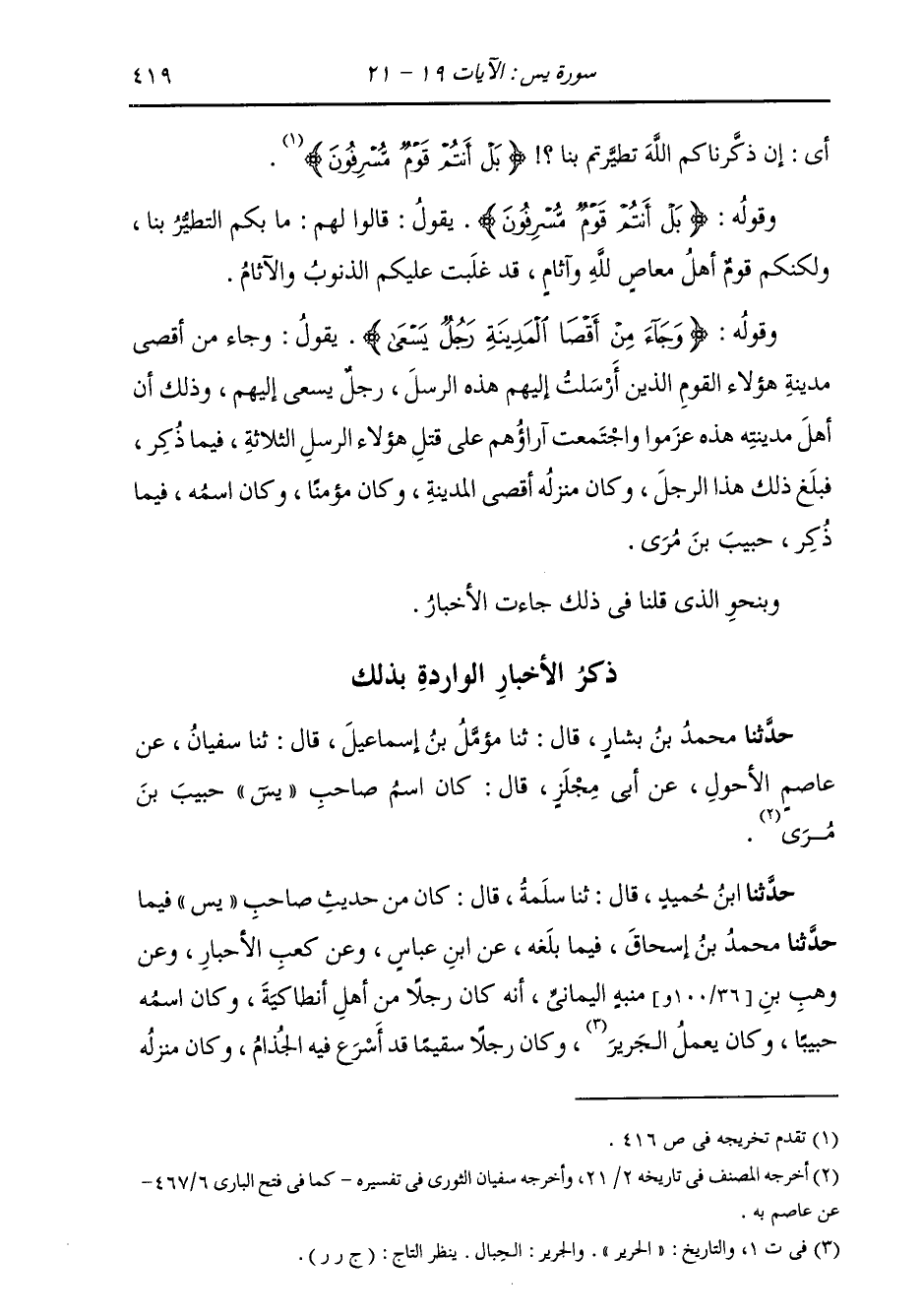 ذِكْرُ الْأَخْبَارِ الْوَارِدَةِ بِذَلِكَ: حَدَّثَنَا مُحَمَّدُ بْنُ بَشَّارٍ، قَالَ: ثنا مُؤَمَّلُ بْنُ إِسْمَاعِيلَ، قَالَ: ثنا سُفْيَانُ، عَنْ عَاصِمٍ الْأَحْوَلِ، عَنْ أَبِي مِجْلَزٍ، قَالَ: «§كَانَ صَاحِبُ يَس حَبِيبَ بْنَ مُرِّيٍّ»