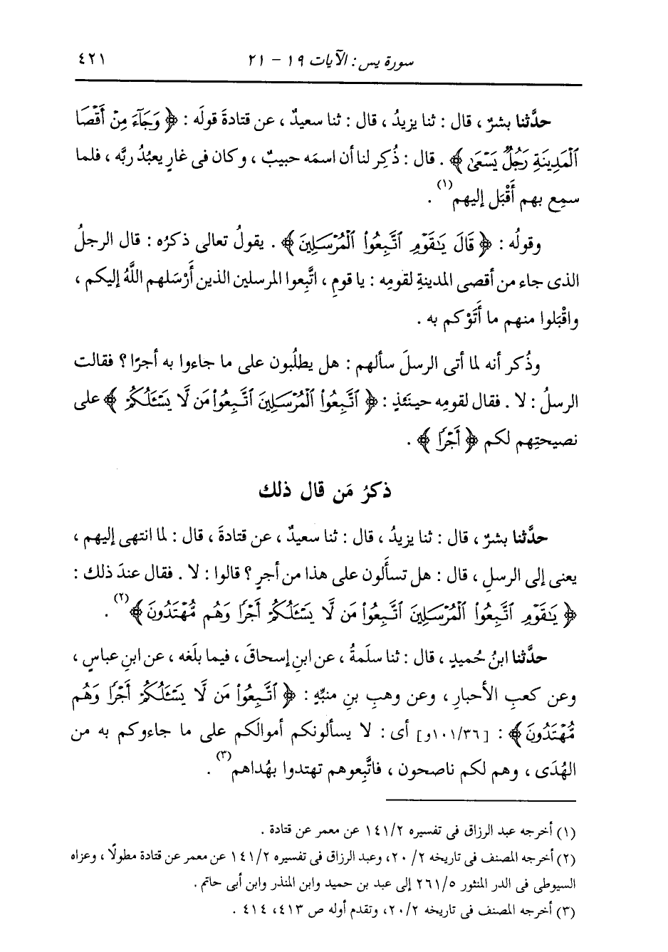 ذِكْرُ مَنْ قَالَ ذَلِكَ: حَدَّثَنَا بِشْرٌ، قَالَ: ثنا يَزِيدُ، قَالَ: ثنا سَعِيدٌ، عَنْ قَتَادَةَ، قَالَ: " لَمَّا انْتَهَى إِلَيْهِمْ، يَعْنِي إِلَى الرُّسُلِ، قَالَ: §هَلْ تُسْأَلُونَ عَلَى هَذَا مِنْ أَجْرٍ؟ قَالُوا: لَا، فَقَالَ عِنْدَ ذَلِكَ: {يَا قَوْمِ اتَّبِعُوا الْمُرْسَلِينَ اتَّبِعُوا مَنْ لَا يَسْأَلُكُمْ أَجْرًا وَهُمْ مُهْتَدُونَ} [يس: 21]
