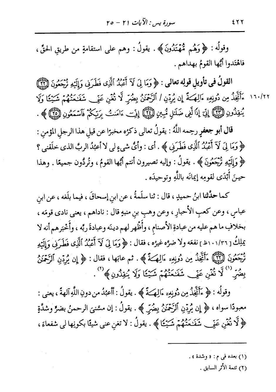 §الْقَوْلُ فِي تَأْوِيلِ قَوْلِهِ تَعَالَى: {وَمَالِي لَا أَعْبُدُ الَّذِي فَطَرَنِي وَإِلَيْهِ تُرْجَعُونَ أَأَتَّخِذُ مِنْ دُونِهِ آلِهَةً إِنْ يُرِدْنِ الرَّحْمَنُ بِضُرٍّ لَا تُغْنِ عَنِّي شَفَاعَتُهُمْ شَيْئًا وَلَا يُنقِذُونِ إِنِّي إِذًا لَفِي ضَلَالٍ مُبِينٍ إِنِّي آمَنْتُ بِرَبِّكُمْ فَاسْمَعُونِ} يَقُولُ تَعَالَى ذِكْرُهُ مُخْبِرًا عَنْ قِيلِ هَذَا الرَّجُلِ الْمُؤْمِنِ {وَمَالِيَ لَا أَعْبُدُ الَّذِي فَطَرَنِي} أَيْ وَأَيُّ شَيْءٍ لِيَ لَا أَعْبُدُ الرَّبَّ الَّذِي خَلَقَنِي {وَإِلَيْهِ تُرْجَعُونَ} [البقرة: 245] يَقُولُ: وَإِلَيْهِ تَصِيرُونَ أَنْتُمْ أَيُّهَا الْقَوْمُ وَتُرَدُّونَ جَمِيعًا، وَهَذَا حِينَ أَبْدَى لِقَوْمِهِ إِيمَانَهُ بِاللَّهِ وَتَوْحِيدَهُ