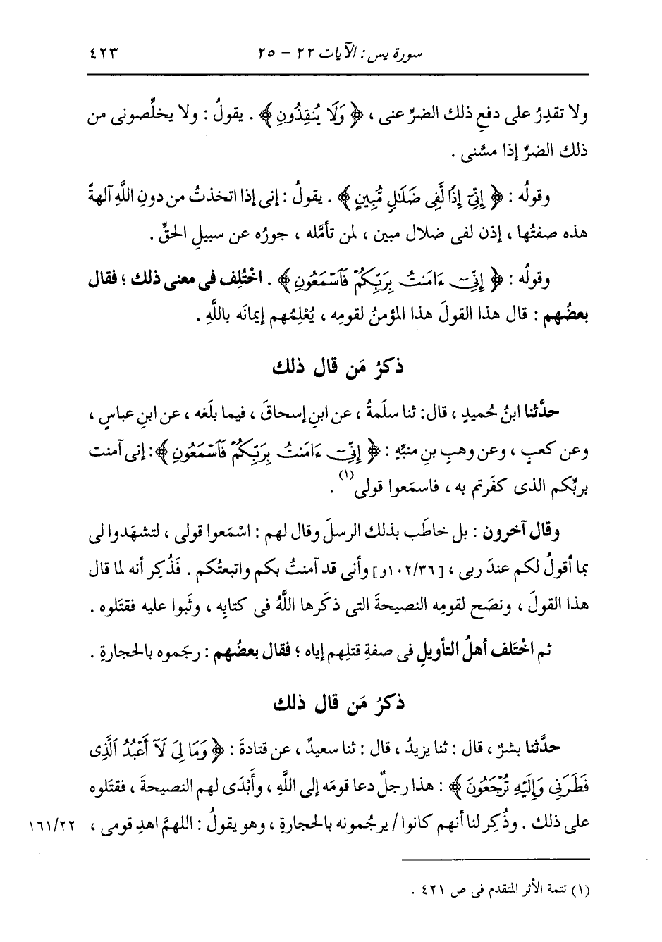 ذِكْرُ مَنْ قَالَ ذَلِكَ: حَدَّثَنَا ابْنُ حُمَيْدٍ، قَالَ: ثنا سَلَمَةُ، عَنِ ابْنِ إِسْحَاقَ، فِيمَا بَلَغَهُ، عَنِ ابْنِ عَبَّاسٍ، وَعَنْ كَعْبٍ، وَعَنْ وَهْبِ بْنِ مُنَبِّهٍ {§إِنِّي آمَنْتُ بِرَبِّكُمْ فَاسْمَعُونِ} [يس: 25] «إِنِّي آمَنْتُ بِرَبِّكُمُ الَّذِي كَفَرْتُمْ بِهِ، فَاسْمَعُوا قُولِي» وَقَالَ آخَرُونَ: بَلْ خَاطَبَ بِذَلِكَ الرُّسُلَ، وَقَالَ لَهُمُ: اسْمَعُوا قُولِي لِتَشْهَدُوا لِي بِمَا أَقُولُ لَكُمْ عِنْدَ رَبِّي، وَأَنِّي قَدْ آمَنْتُ بِكُمْ وَاتَّبَعْتُكُمْ؛ فَذَكَرَ أَنَّهُ لَمَّا قَالَ هَذَا الْقَوْلَ، وَنَصَحَ لِقَوْمِهِ النَّصِيحَةَ الَّتِي ذَكَرَهَا اللَّهُ فِي كِتَابِهِ وَثَبُوا بِهِ فَقَتَلُوهُ ثُمَّ اخْتَلَفَ أَهْلُ التَّأْوِيلِ فِي صِفَةِ قَتْلِهِمْ إِيَّاهُ، فَقَالَ بَعْضُهُمْ: رَجَمُوهُ بِالْحِجَارَةِ
