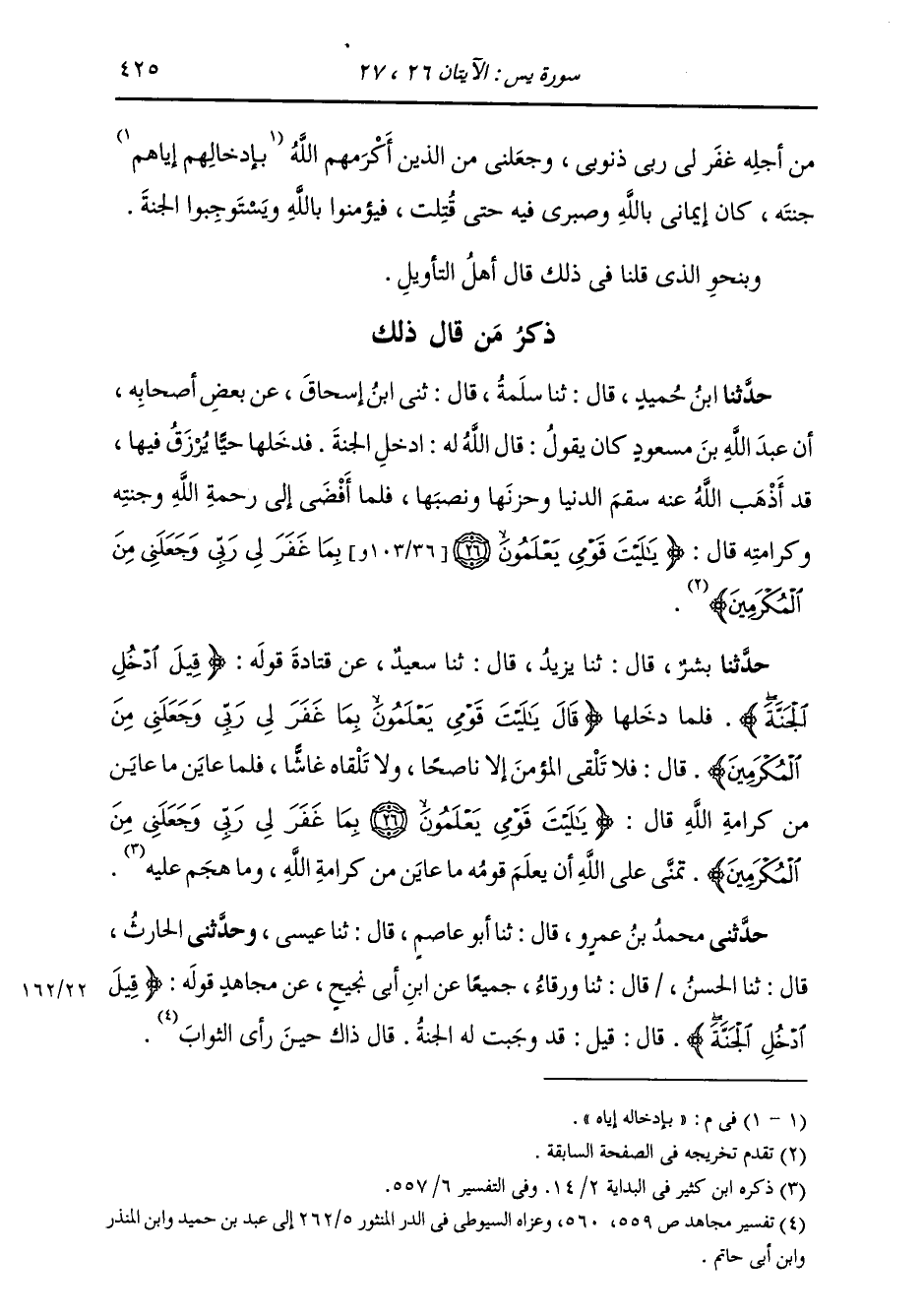 ذِكْرُ مَنْ قَالَ ذَلِكَ: حَدَّثَنَا ابْنُ حُمَيْدٍ، قَالَ: ثنا سَلَمَةُ، قَالَ: ثني ابْنُ إِسْحَاقَ، عَنْ بَعْضٍ أَصْحَابِهِ أَنَّ عَبْدَ اللَّهِ بْنَ مَسْعُودٍ كَانَ يَقُولُ: " قَالَ اللَّهُ لَهُ: §ادْخُلِ الْجَنَّةَ، فَدَخَلَهَا حَيًّا يُرْزَقُ فِيهَا، قَدْ أَذْهَبَ اللَّهُ عَنْهُ سَقَمَ الدُّنْيَا وَحُزْنَهَا وَنَصَبَهَا، فَلَمَّا أُفْضِيَ إِلَى رَحْمَةِ اللَّهِ وَجَنَّتِهِ وَكَرَامَتِهِ " {قَالَ: يَا لَيْتَ قَوْمِي يَعْلَمُونَ بِمَا غَفَرَ لِي رَبِّي وَجَعَلَنِي مِنَ الْمُكْرَمِينَ} [يس: 27]